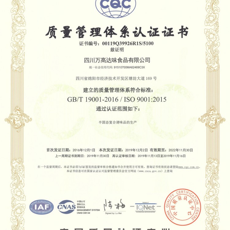 | 發(fā)證機(jī)構(gòu): | 中國質(zhì)量認(rèn)證中心 | 發(fā)證時間 : | 2019-12-02 |