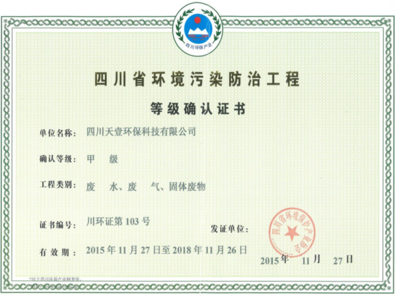 | 發(fā)證機(jī)構(gòu): | 四川省環(huán)境環(huán)境保護(hù)產(chǎn)業(yè)協(xié)會(huì) | 發(fā)證時(shí)間 : | 2015-11-27 |