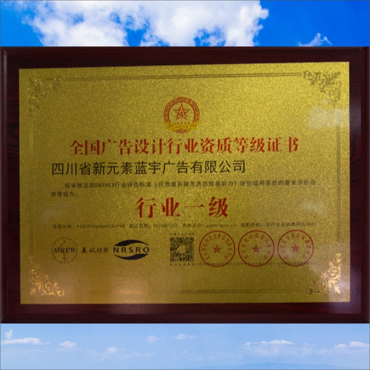 證書介紹  全國廣告設計行業(yè)資質(zhì)等級證書:四川省新元素藍宇廣告有限公司經(jīng)審核達到SNXHEX行業(yè)評價標準《經(jīng)營服務規(guī)范資質(zhì)服務能力》評價適用條款的要求評價資質(zhì)等級為:行業(yè)一級。信用代碼:91510106066955010R,發(fā)證日期:2020年10月,資質(zhì)公示:gsxt-gov.cn,監(jiān)制機構(gòu):百行企業(yè)資質(zhì)評估中心。