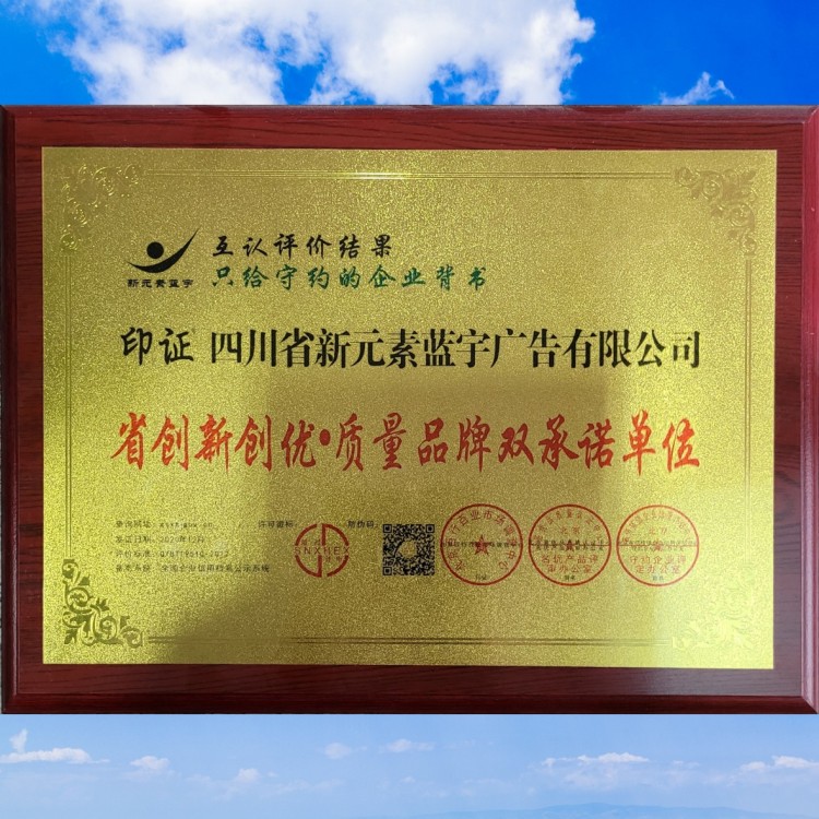 證書介紹  印證四川省新元素藍宇廣告有限公司省創(chuàng)新創(chuàng)優(yōu).質量品牌雙承諾單位,查詢網(wǎng)址:gsxt-gov.cn,發(fā)證日期:2020年12月,評價標準:Q/BT19510-2017,備案系統(tǒng):全國企業(yè)信用檔案公示系統(tǒng)