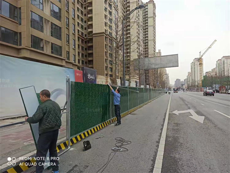 圍擋基腳采用M10水泥砂漿砌筑MU10頁(yè)巖磚磚砌0.5*0.5的基礎(chǔ),用于增強(qiáng)圍擋抗風(fēng)穩(wěn)定性;pvc圍擋設(shè)2.5米高,寬3米為一板。施工圍擋做美化處理,噴涂企業(yè)名稱、安全、質(zhì)量、文明施工用語(yǔ)及開發(fā)項(xiàng)目商業(yè)廣告,嚴(yán)禁張貼、涂寫垃圾廣告。
