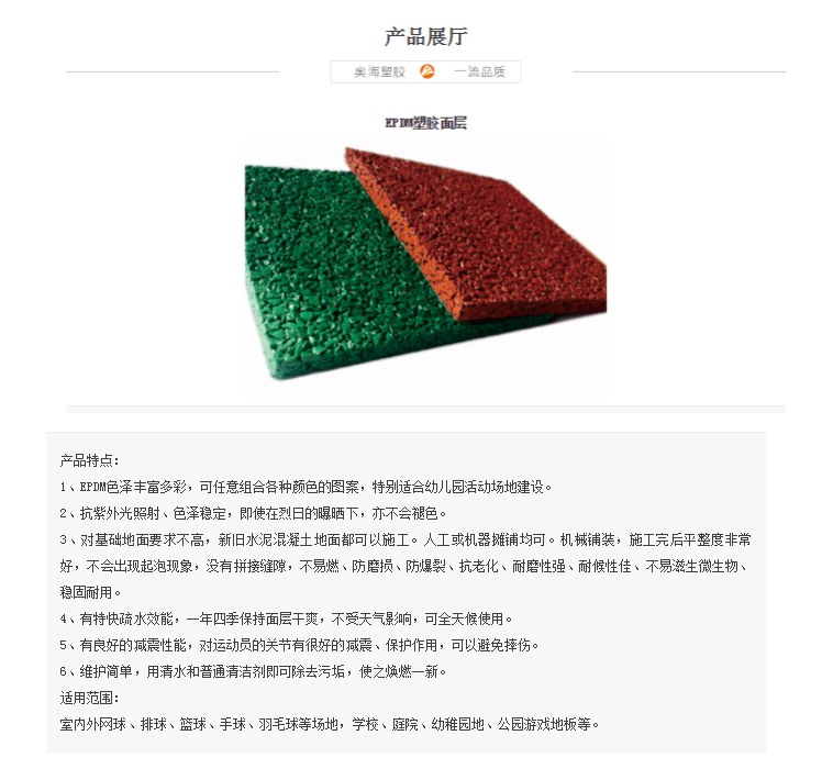 適用范圍:室內(nèi)外網(wǎng)球、排球、籃球、手球、羽毛球等場地,學(xué)校、庭院、幼稚園地、公園游戲地板等。