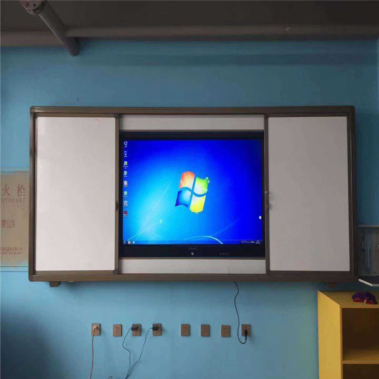 2、結(jié)構(gòu):左右推拉結(jié)構(gòu)(內(nèi)置軌道,外框和軌道一體化設(shè)計)。板面雙層設(shè)計,內(nèi)層為固定書寫板與教學(xué)設(shè)備并行,外層為滑動書寫板,使用教學(xué)設(shè)備時可將滑動板推到兩側(cè)側(cè)露出教學(xué)設(shè)備即可使用,不用時可將滑動板拉到前面完全遮擋教學(xué)設(shè)備并鎖定。黑板與教學(xué)設(shè)備之間完美鑲嵌,壁掛設(shè)計。