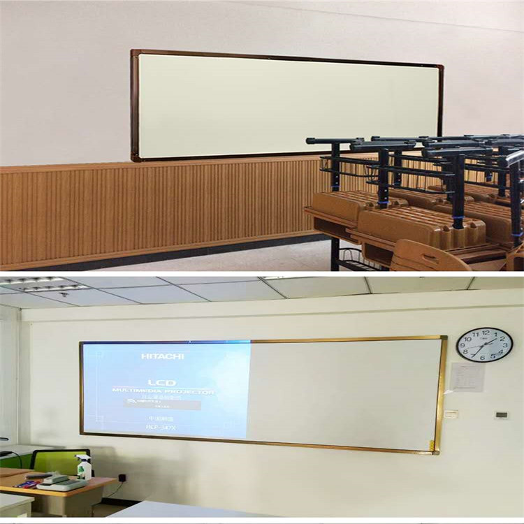 2、結構:左右推拉結構(內置軌道,外框和軌道一體化設計)。板面雙層設計,內層為固定書寫板與教學設備并行,外層為滑動書寫板,使用教學設備時可將滑動板推到兩側側露出教學設備即可使用,不用時可將滑動板拉到前面完全遮擋教學設備并鎖定。黑板與教學設備之間完美鑲嵌,壁掛設計。