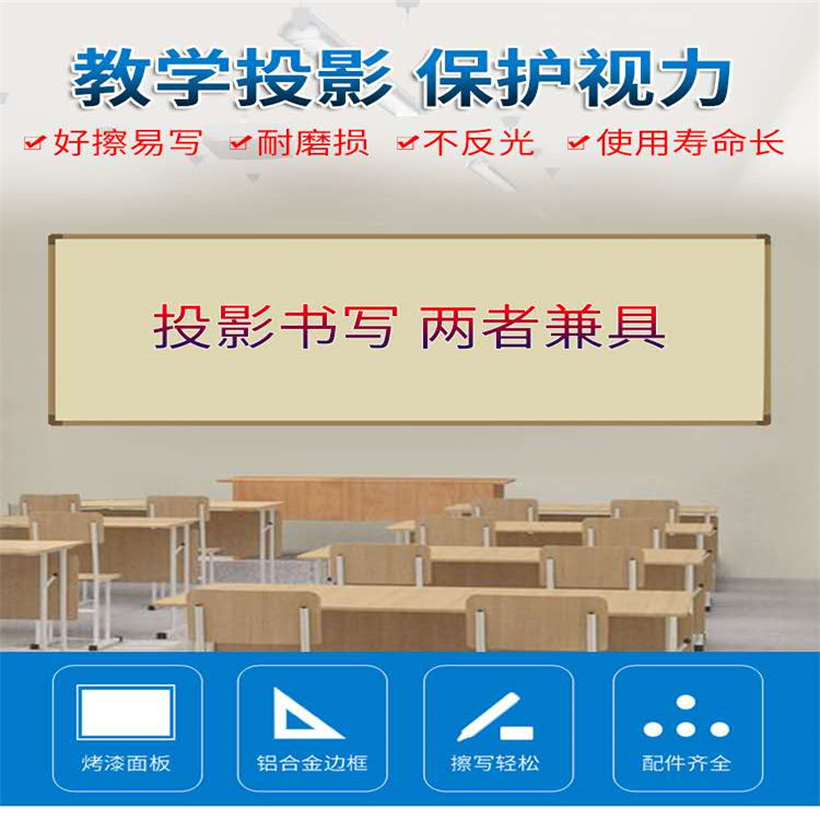 3、板面材質:面板采用進口烤漆板,墨綠色、亞光,厚度0.3mm,板體附著面無裂紋、無流痕、無氣泡等;板面細膩平整、書寫流暢、字跡清晰、擦后無殘留、耐磨損、耐腐蝕;板面顏色色調柔和、時尚美觀,學生任何角度都能正常觀看,可視效果好,有效保護師生的視力健康。