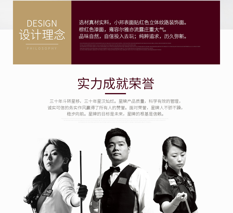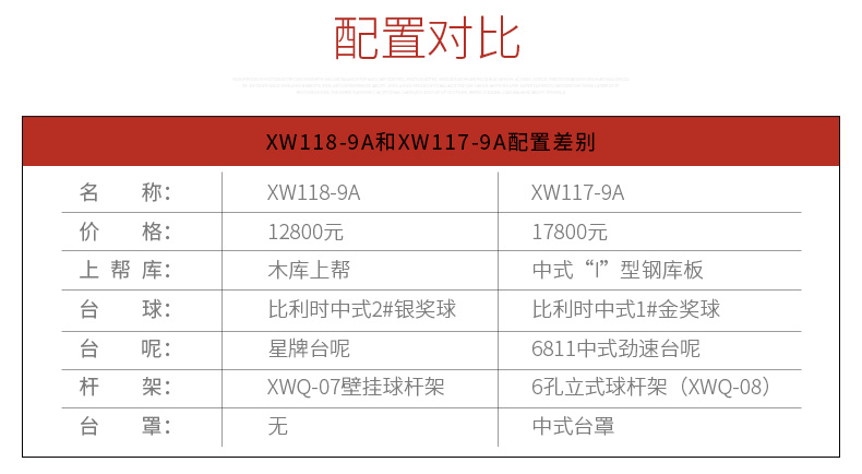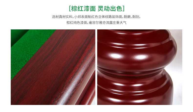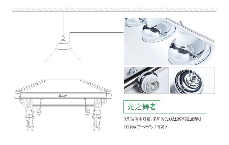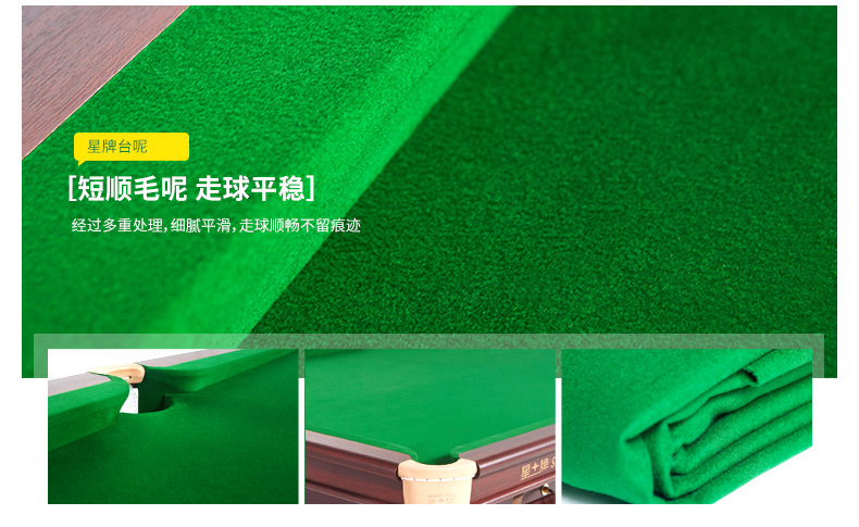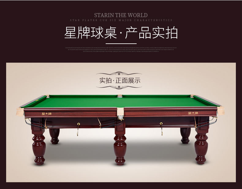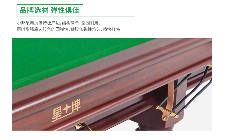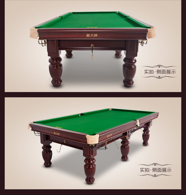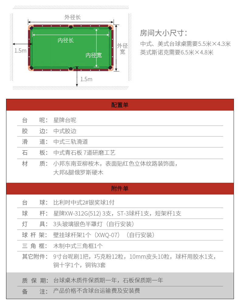 3道精磨青石板,抗劃面板,臺灣膠邊,高密度磚石腿,機械壓袋口。尺寸:2.82*1.54*0.85米。配置:星牌臺尼,比利時2號水晶球,開球桿1支,中式球桿1支,通桿2支,3頭燈,桿架1個,短架1個,刷子1把,三角框1個,膠水2支,皮頭巧粉各5粒