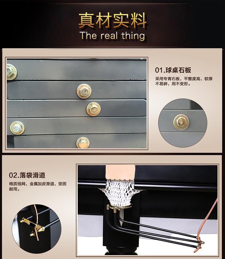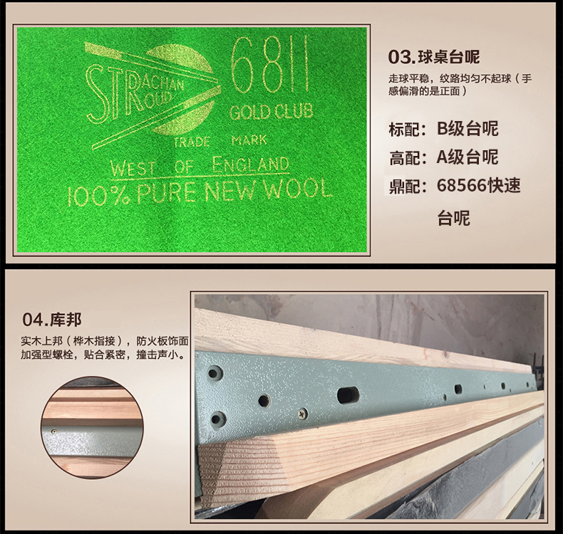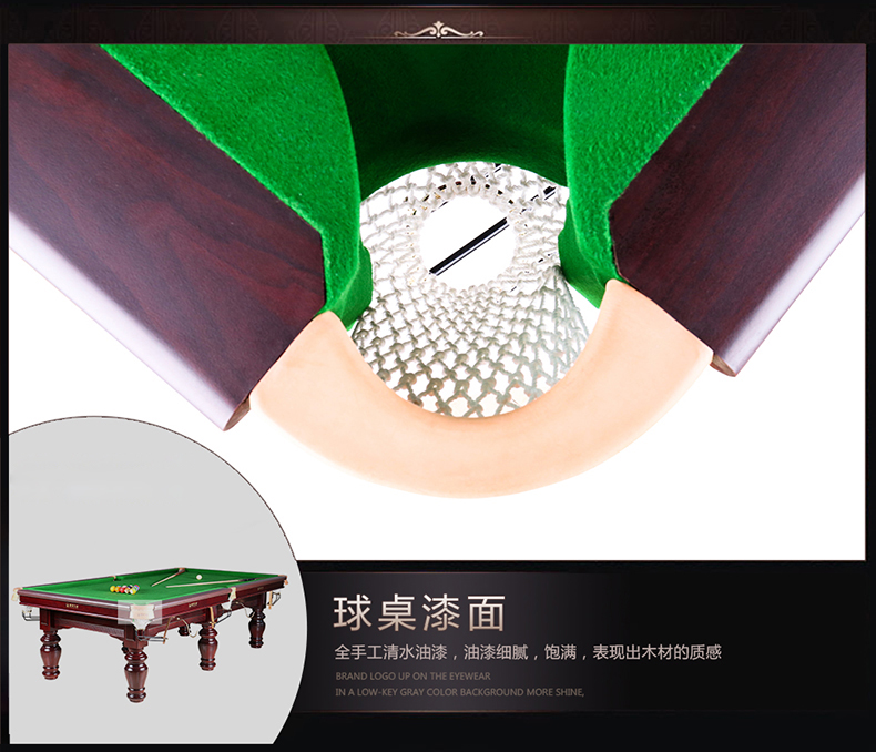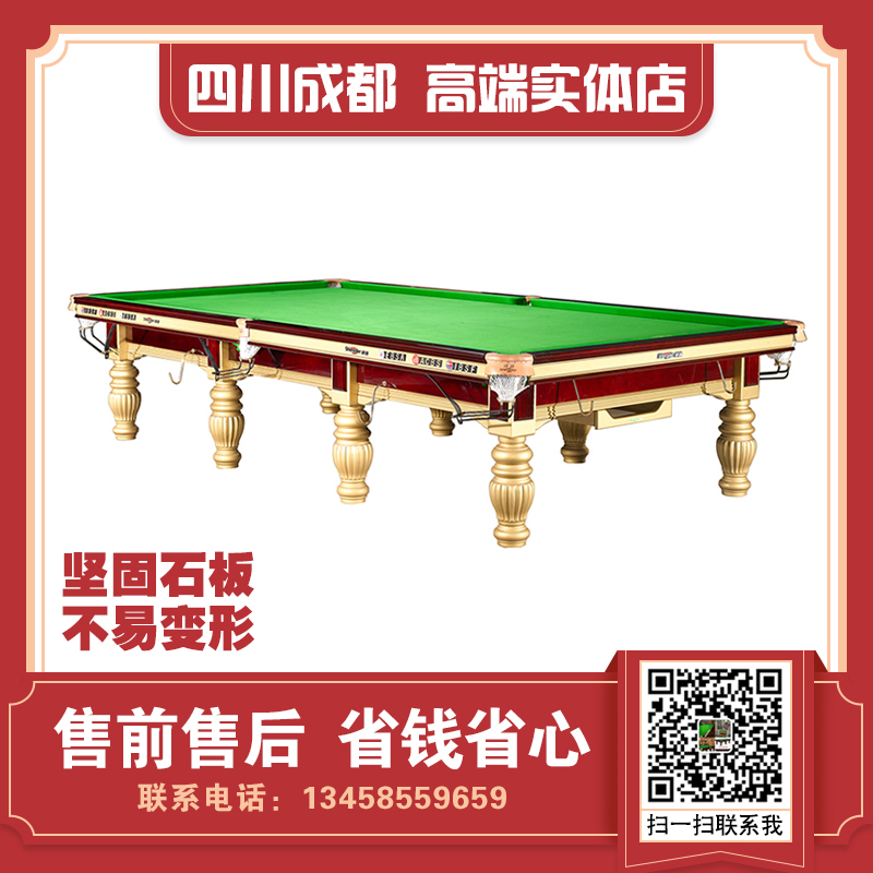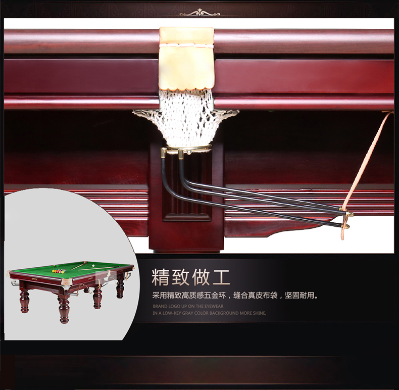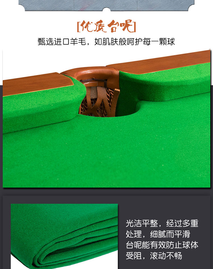 A級(jí)青石板,美國(guó)進(jìn)口防火板,實(shí)木扶手。尺寸:2.03*3.83*0.85米,配置:臺(tái)尼一張,英式球1盒,球桿4支,架桿4支,長(zhǎng)打長(zhǎng)架,巧粉12粒,手套2個(gè),皮頭10粒,膠水1粒,桿架1個(gè),三角框1個(gè)