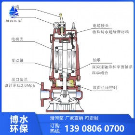 4、不銹鋼無堵塞排污泵密封油室內(nèi)設(shè)置有高精度抗干擾漏水檢測傳感器,定子繞組內(nèi)預(yù)埋了熱敏元件,對水泵電機(jī)自動保護(hù)。