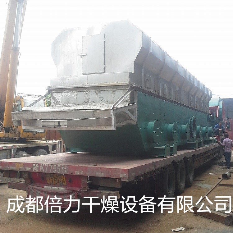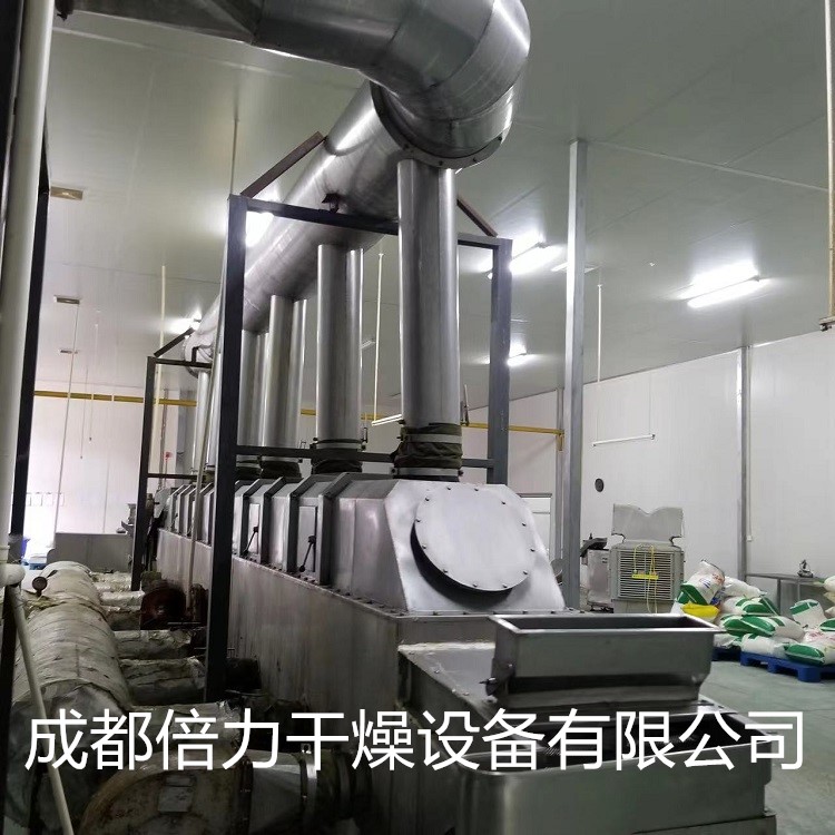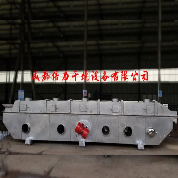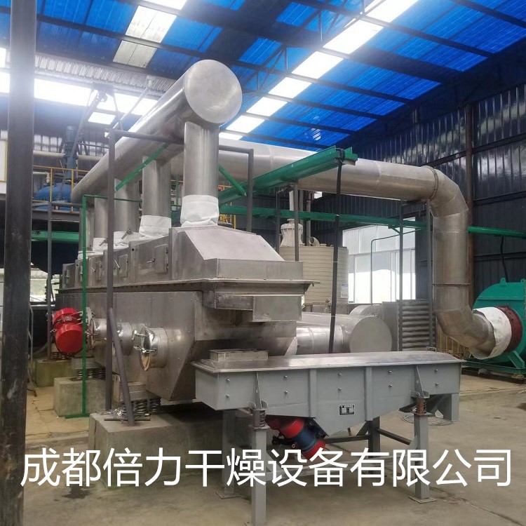 物料自進(jìn)料進(jìn)口進(jìn)入機(jī)內(nèi),在振動(dòng)力作用下,物料沿水平面流化床拋擲,向前連續(xù)運(yùn)動(dòng),熱風(fēng)向上穿過流化床同濕物料換熱后,濕空氣經(jīng)旋風(fēng)分離器除塵后由排風(fēng)排出.干燥物料由排料進(jìn)口排出。