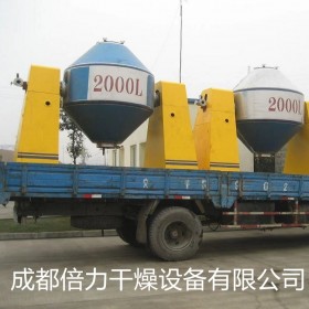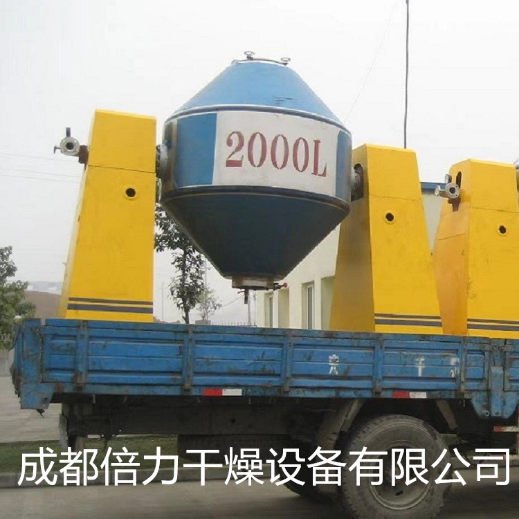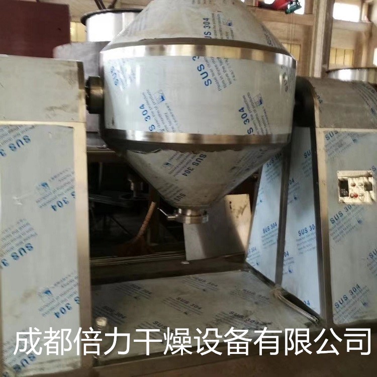 雙錐回轉(zhuǎn)真空干燥機為雙錐形的回轉(zhuǎn)罐體,罐內(nèi)在真空狀態(tài)下,向夾套內(nèi)通入蒸汽或熱水進(jìn)行加熱,熱量通過罐體內(nèi)壁與濕物料接觸,濕物料吸熱后蒸發(fā)的水汽,通過真空泵經(jīng)真空排氣管被抽走。由于罐體內(nèi)處于真空狀態(tài),且罐體的回轉(zhuǎn)使物料不斷的上下內(nèi)外翻動,故加快了物料的干燥速度,提高干燥效率,達(dá)到均勻干燥的目的。