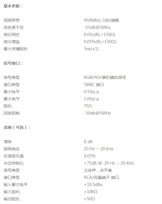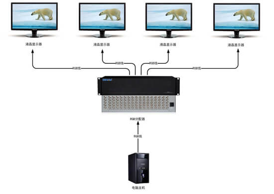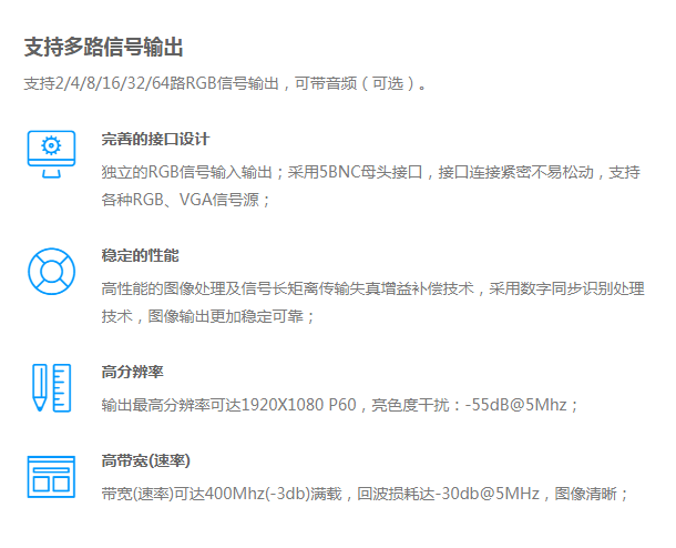 RGB分配器,是伯奧克生產(chǎn)的一款高性能的專(zhuān)業(yè)PC信號(hào)分配設(shè)備,用于將RGB信號(hào)分配復(fù)制為多路RGB信號(hào),提供獨(dú)立的RGBHV分量輸入、輸出端子,每路分量信號(hào)單獨(dú)傳輸,單獨(dú)切換,使信號(hào)傳輸衰減降至極低,圖像信號(hào)能高保真輸出。由于VGA傳輸距離短,所以實(shí)際工程中為了傳輸更遠(yuǎn)的距離,人們把VGA線拆開(kāi),將RGBHV五種信號(hào)分離出來(lái),分別用五根同軸電纜傳輸,這種傳輸方式叫RGB傳輸,習(xí)慣上這種信號(hào)也叫RGB信號(hào),其實(shí)本質(zhì)上RGB和VGA是沒(méi)有什么區(qū)別的。 RGB分配器是專(zhuān)門(mén)為計(jì)算機(jī)高分辨率 RGBHV 信號(hào)的顯示分配而設(shè)計(jì)的高性能寬帶設(shè)備,該系列產(chǎn)品可廣泛應(yīng)用于大屏幕投影顯示工程 、電化教學(xué)、指揮控制中心、多媒體會(huì)議室等場(chǎng)合。