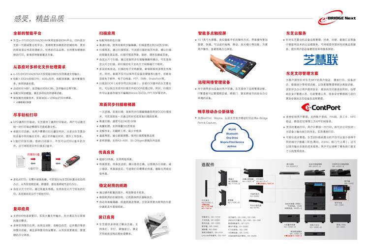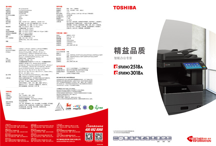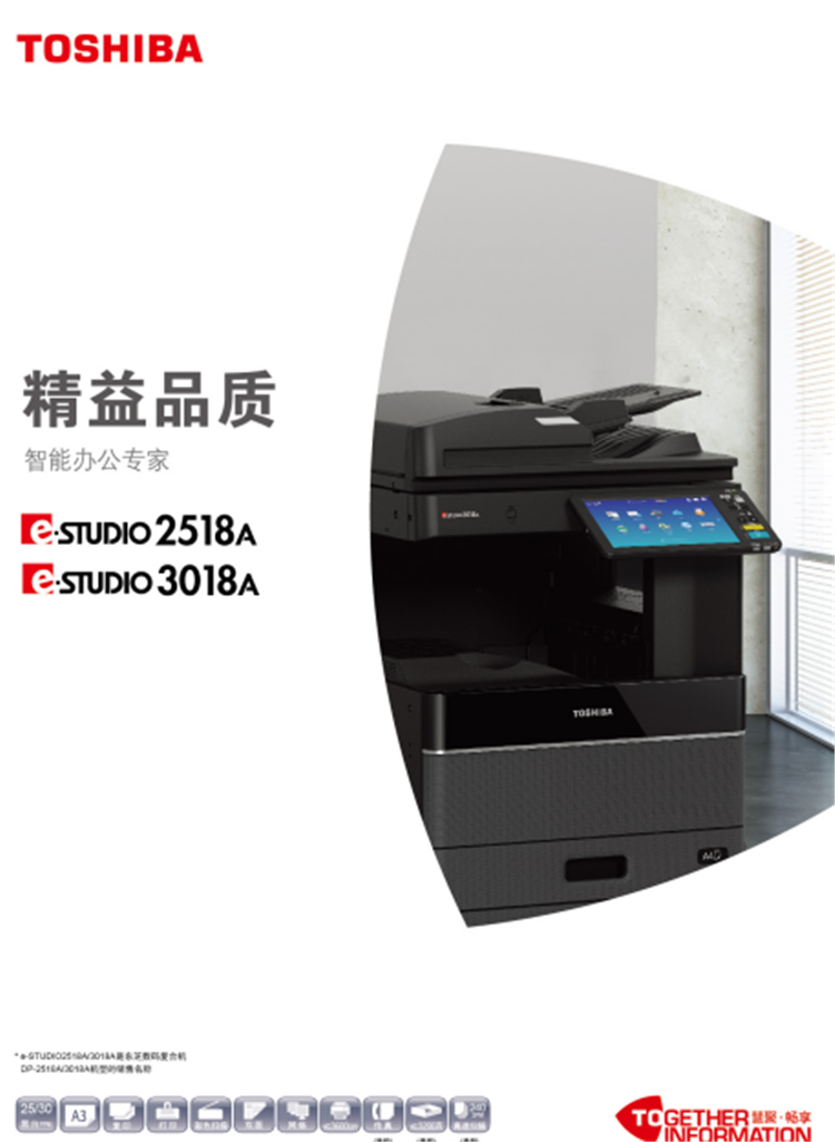 東芝數(shù)碼復(fù)合機擁有穩(wěn)固的機械結(jié)構(gòu),強大的紙張適應(yīng)性及處理能力,精細的印品品質(zhì),同時兼容多種智能解決方案,能滿足更多樣化,更高標準的現(xiàn)代辦公需求。東芝產(chǎn)品將盡可能地減少對地球生態(tài)環(huán)境的影響。全新EBX2處理平臺,強大處理系統(tǒng),標配2G內(nèi)存,高效應(yīng)對大量打印和復(fù)印作業(yè),標配320G硬盤,輕松存儲海量文件,東芝通用打印驅(qū)動(UPD)可以輕松打印CBX平臺復(fù)合機,支持擁有PCL/PS打印語言,還可以實現(xiàn)多臺設(shè)備并行打印,高速文件輸出,高速 文件掃描,支持紙張容量可以達到7600頁,東芝復(fù)印機不停機更換墨粉,高效作業(yè)處理。連續(xù)作業(yè)輸出1-9999份,自定義12060個模板,讓多個步驟實現(xiàn)一鍵操作模式,東芝智橋打印及掃描應(yīng)用程序可以自動檢索無線局網(wǎng)或通過二維碼定位方式選擇東芝設(shè)備,隨時隨地的進行移動的文件掃描,打印操作,并能將掃描文件上傳至云存儲的服務(wù)端,東芝全系列數(shù)碼復(fù)合機的鼓及其載體壽命可以達到60萬張,一只碳粉按照A4覆蓋率5%,單只可以打印88680張,讓成本降至低,利潤大化,東芝系列復(fù)合機采用無紙化傳真,直接實現(xiàn)電腦文件發(fā)送,無需打印,更好的節(jié)約碳粉,減少機器損耗,自動識別并忽略空白頁面輸出,設(shè)備還標配節(jié)能功能模式,自動進入超級睡眠模式,每小時耗電小于1瓦特,東芝全系列設(shè)備通過過濾技術(shù)實現(xiàn)256級灰度的2400x600DPI復(fù)印輸出,無論是文字還是圖片都可以真實還原,清楚傳遞信息,東芝系列配備了彩色掃描功能,輕松實現(xiàn)45-77的彩色掃描,黑白掃描可以每分鐘可以達到80張頁,掃描支持PDF,JPG,TYFF,XPS,高壓縮PDF,加密PDF等多種文件格式,方便用戶多樣使用,東芝系列在操作及其使用管理方面獨具一格,操作面板采用9-10.5英寸的彩色液晶觸摸面板,大按鈕式的設(shè)計不但緩解眼睛壓力,而且上你操作設(shè)備時更方便,面板右側(cè)為客戶準備了USB接口,你只需輕輕插入U盤,其中的文件便可輕松打印,還可以把掃描的文件直接保存至U盤,還為客戶建立201組模塊功能,用戶可輕松定義快捷功能按鈕,輕松管理成本,用戶可以開啟部門代碼,通過分配1000個代碼來控制各部門以及個人的印量,支持域及其相關(guān)個人管理,用戶可對打印,復(fù)印,掃描,傳真等功能進行限制,也可對個人計數(shù)進行管理,支持刷卡管理,支持WINDOWS域賬戶,LDAP賬戶和本地復(fù)合機賬戶三種管理方式,采購東芝數(shù)碼復(fù)合機為企業(yè),學(xué)校,政府,個人節(jié)約成本,減少不必要的開銷。