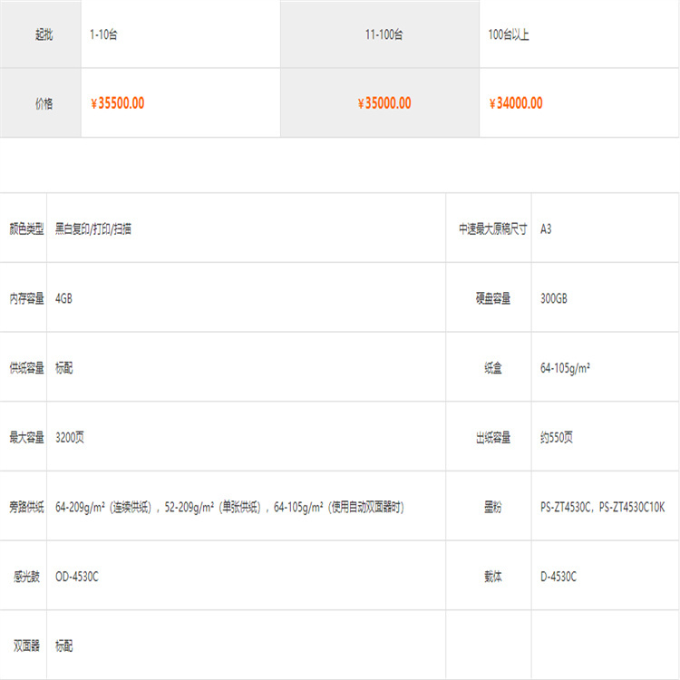 速度類型:中速;原稿尺寸:A3內(nèi)存容量:4GB硬盤容量:300GB供紙容量:標(biāo)配紙盒:1200頁