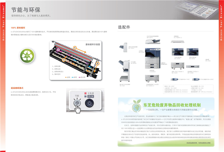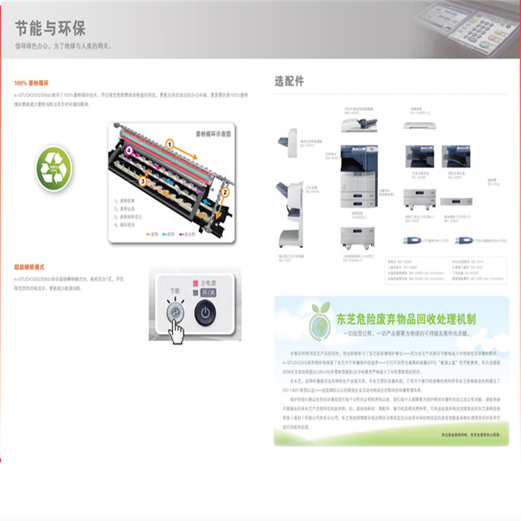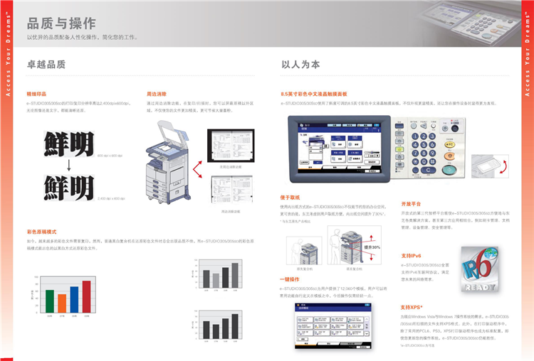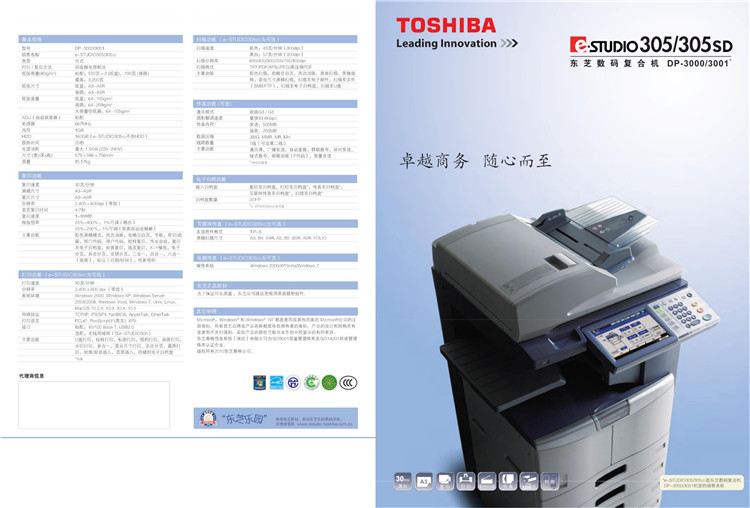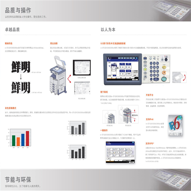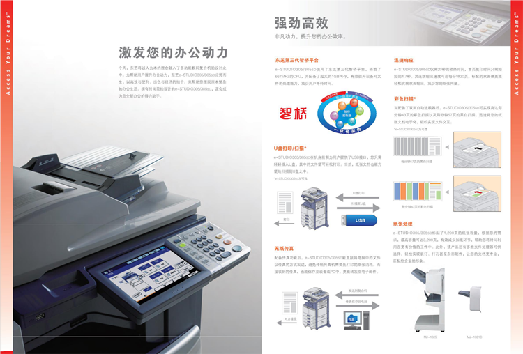 東芝數(shù)碼復(fù)合機(jī)擁有穩(wěn)固的機(jī)械結(jié)構(gòu),強(qiáng)大的紙張適應(yīng)性及處理能力,精細(xì)的印品品質(zhì),同時(shí)兼容多種智能解決方案,能滿足更多樣化,更高標(biāo)準(zhǔn)的現(xiàn)代辦公需求。東芝產(chǎn)品將盡可能地減少對(duì)地球生態(tài)環(huán)境的影響。全新EBX2處理平臺(tái),強(qiáng)大處理系統(tǒng),標(biāo)配2G內(nèi)存,高效應(yīng)對(duì)大量打印和復(fù)印作業(yè),標(biāo)配320G硬盤,輕松存儲(chǔ)海量文件,東芝通用打印驅(qū)動(dòng)(UPD)可以輕松打印CBX平臺(tái)復(fù)合機(jī),支持擁有PCL/PS打印語言,還可以實(shí)現(xiàn)多臺(tái)設(shè)備并行打印,高速文件輸出,高速 文件掃描,支持紙張容量可以達(dá)到7600頁(yè),東芝復(fù)印機(jī)不停機(jī)更換墨粉,高效作業(yè)處理。連續(xù)作業(yè)輸出1-9999份,自定義12060個(gè)模板,讓多個(gè)步驟實(shí)現(xiàn)一鍵操作模式,東芝智橋打印及掃描應(yīng)用程序可以自動(dòng)檢索無線局網(wǎng)或通過二維碼定位方式選擇東芝設(shè)備,隨時(shí)隨地的進(jìn)行移動(dòng)的文件掃描,打印操作,并能將掃描文件上傳至云存儲(chǔ)的服務(wù)端,東芝全系列數(shù)碼復(fù)合機(jī)的鼓及其載體壽命可以達(dá)到60萬張,一只碳粉按照A4覆蓋率5%,單只可以打印88680張,讓成本降至低,利潤(rùn)大化,東芝系列復(fù)合機(jī)采用無紙化傳真,直接實(shí)現(xiàn)電腦文件發(fā)送,無需打印,更好的節(jié)約碳粉,減少機(jī)器損耗,自動(dòng)識(shí)別并忽略空白頁(yè)面輸出,設(shè)備還標(biāo)配節(jié)能功能模式,自動(dòng)進(jìn)入超級(jí)睡眠模式,每小時(shí)耗電小于1瓦特,東芝全系列設(shè)備通過過濾技術(shù)實(shí)現(xiàn)256級(jí)灰度的2400x600DPI復(fù)印輸出,無論是文字還是圖片都可以真實(shí)還原,清楚傳遞信息,東芝系列配備了彩色掃描功能,輕松實(shí)現(xiàn)45-77的彩色掃描,黑白掃描可以每分鐘可以達(dá)到80張頁(yè),掃描支持PDF,JPG,TYFF,XPS,高壓縮PDF,加密PDF等多種文件格式,方便用戶多樣使用,東芝系列在操作及其使用管理方面獨(dú)具一格,操作面板采用9-10.5英寸的彩色液晶觸摸面板,大按鈕式的設(shè)計(jì)不但緩解眼睛壓力,而且上你操作設(shè)備時(shí)更方便,面板右側(cè)為客戶準(zhǔn)備了USB接口,你只需輕輕插入U盤,其中的文件便可輕松打印,還可以把掃描的文件直接保存至U盤,還為客戶建立201組模塊功能,用戶可輕松定義快捷功能按鈕,輕松管理成本,用戶可以開啟部門代碼,通過分配1000個(gè)代碼來控制各部門以及個(gè)人的印量,支持域及其相關(guān)個(gè)人管理,用戶可對(duì)打印,復(fù)印,掃描,傳真等功能進(jìn)行限制,也可對(duì)個(gè)人計(jì)數(shù)進(jìn)行管理,支持刷卡管理,支持WINDOWS域賬戶,LDAP賬戶和本地復(fù)合機(jī)賬戶三種管理方式,采購(gòu)東芝數(shù)碼復(fù)合機(jī)為企業(yè),學(xué)校,政府,個(gè)人節(jié)約成本,減少不必要的開銷。