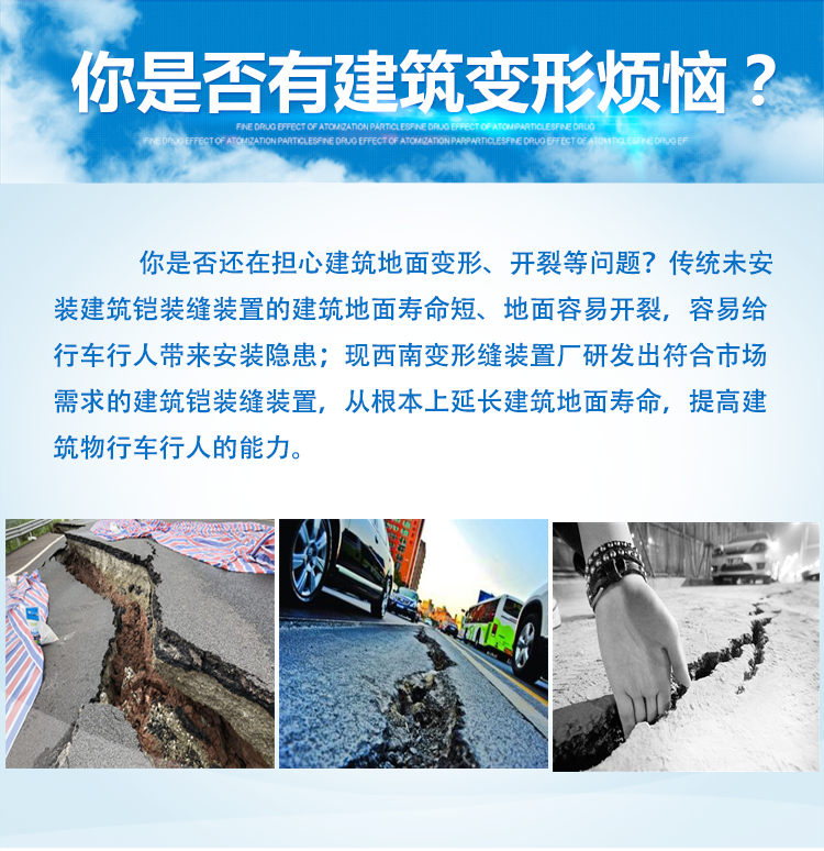 傳統(tǒng)混凝土地坪分倉(cāng)縫做法都是將混凝土澆筑成一個(gè)整體再加以切割,那么就會(huì)導(dǎo)致混凝土壓扁損壞,無法承重過往車輛的碾壓,從而導(dǎo)致分倉(cāng)縫口愈裂愈大,伸縮縫兩邊高低不平的情況產(chǎn)生。當(dāng)然,四季氣候強(qiáng)烈的反差也會(huì)導(dǎo)致伸縮縫隙熱脹冷縮,地面縫寬無法保持在同一平面,產(chǎn)生縫痕缺口。地坪鎧裝縫、混凝土斑馬縫、地面分倉(cāng)縫主要用于重荷載區(qū)域,安裝了鎧裝縫再也不怕人流量大的公共場(chǎng)所了。