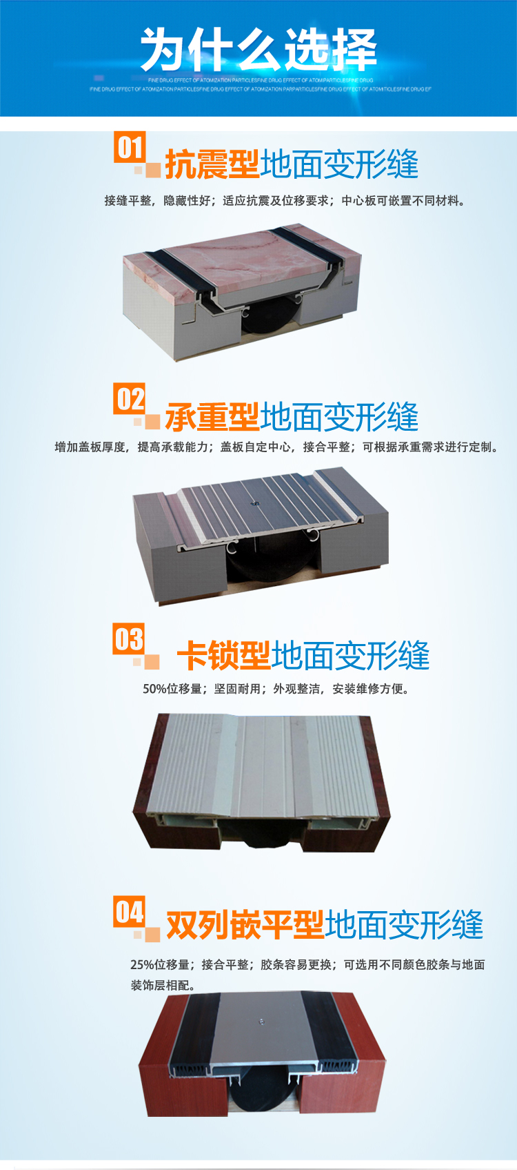 以上建筑地面變形縫出單列嵌平型外,只有伸縮功能,不滿足于建筑沉降及抗震要求,如果需要滿足伸縮,抗震,沉降要求,需要添加抗震彈簧。任何建筑地面變形縫裝置都需要經(jīng)過合理的設計之后,達到建筑本身的要求才行,這樣在溫度變化產(chǎn)生的熱脹冷縮對建筑造成的影響會降到很低,提升建筑應用的使用壽命。