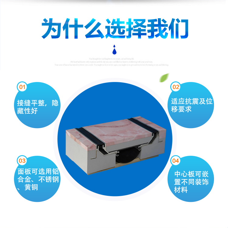 成品樓地面伸縮縫蓋板是暴露于人眼前的變形縫組成部分,其余的變形縫基座、變形縫滑竿等一般均在人眼看不到的部位予以放置。變形縫的基座為固定型材產(chǎn)品,選用鋁合金作為材料,變形縫蓋板要考慮到承重、樣式、裝飾、價格等多方面的因素。