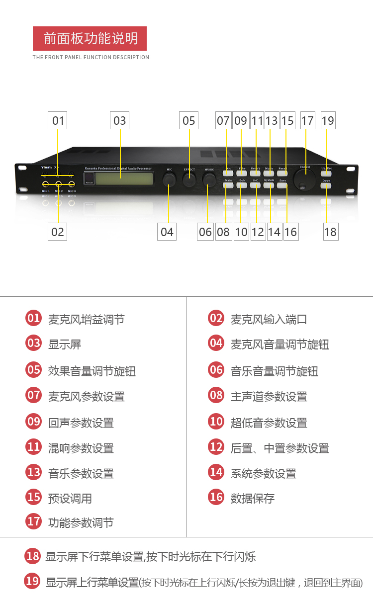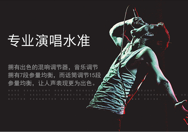| 音樂輸入增益 | ODB/3DB/6DB(用戶模式不可調(diào)節(jié)) | 混響電平可調(diào)范圍 | 0~100% | |
