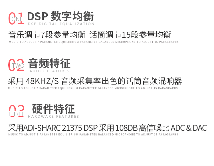 | 回聲高通濾波器 | OHZ-1000HZ | 回聲參量均衡 | 3段 | |