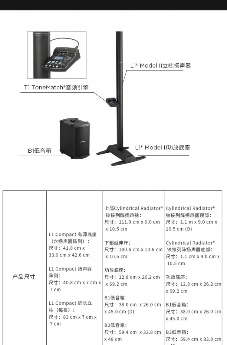 | B1低音箱 | 兩個(gè)5.25英寸(13.3厘米)高輸出、大沖程的揚(yáng)聲器單元,能讓小巧的箱體發(fā)出深厚的低音 | 兩段式互聯(lián)設(shè)計(jì) | Cylindrical Radiator鉸鏈列陣揚(yáng)聲器可以迅速方便地進(jìn)行移動(dòng)、安裝和拆卸。揚(yáng)聲器每個(gè)部分高為1.1米。 | |