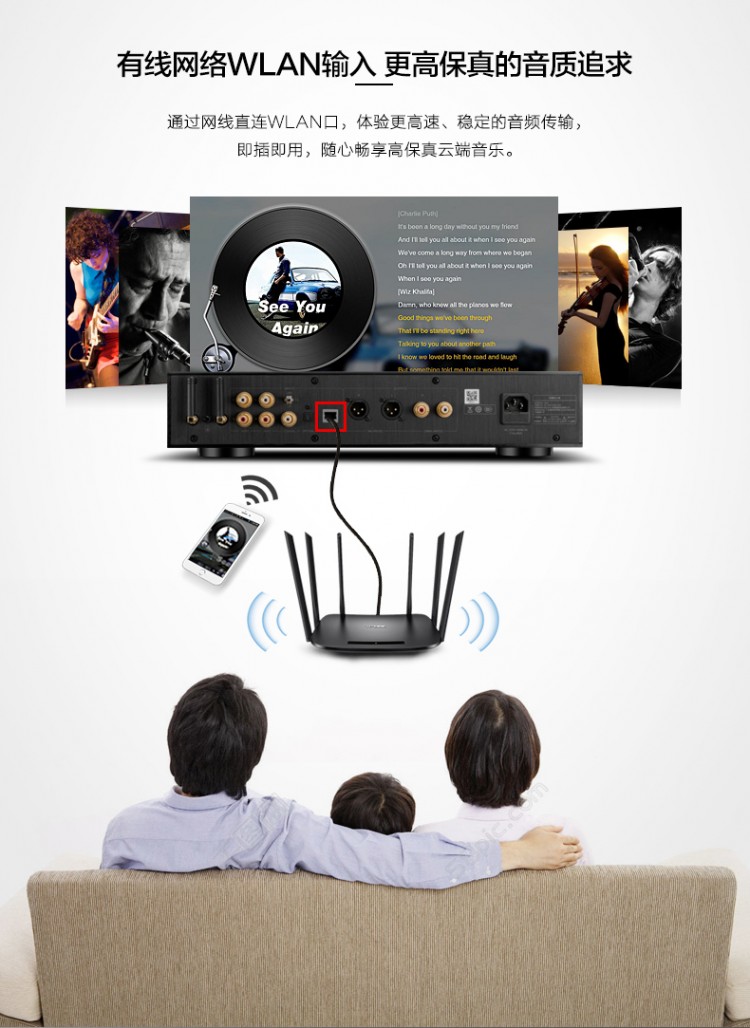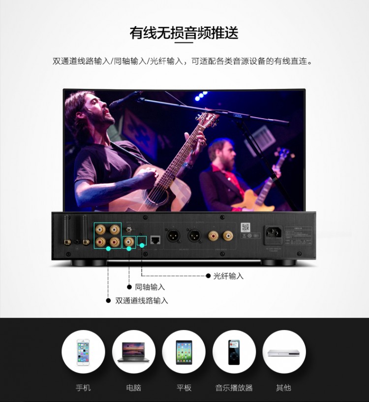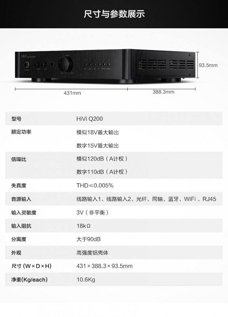 | 失真度 | THD≤0.005% | 音源輸入 | 線路輸入1、線路輸入2、光纖、同軸、藍(lán)牙、WiFi、RJ45 | |