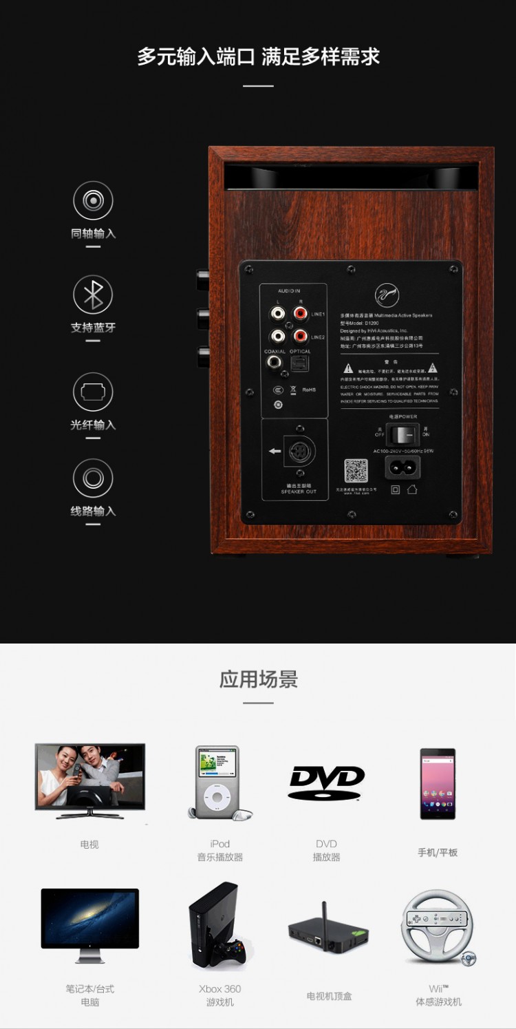 | 音源輸入 | 線路輸入1,線路輸入2,光纖,同軸,藍牙 | 箱體外觀 | 聲學(xué)面板設(shè)計、豪華木紋 | |