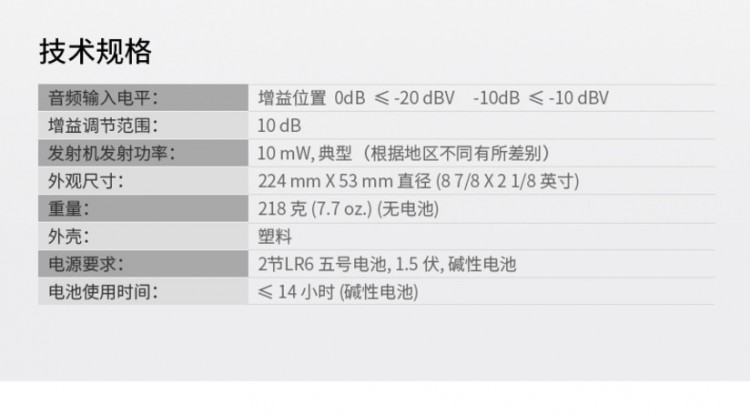 | 話筒發(fā)射機(jī)發(fā)射功率 | 10mW,典型 | 話筒外觀尺寸 | 224mmX53mm直徑(8 7/8X2 1/8英寸) | |