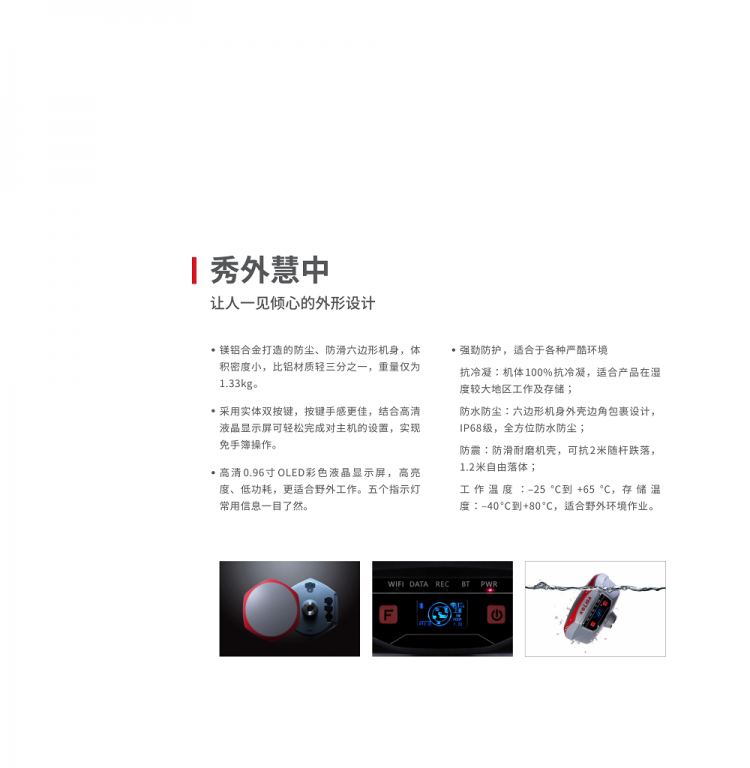 鎂鋁合金打造的防塵。防滑六邊形機(jī)身,體積密度小,比鋁材質(zhì)輕三分之一,重量僅為1.33kg。