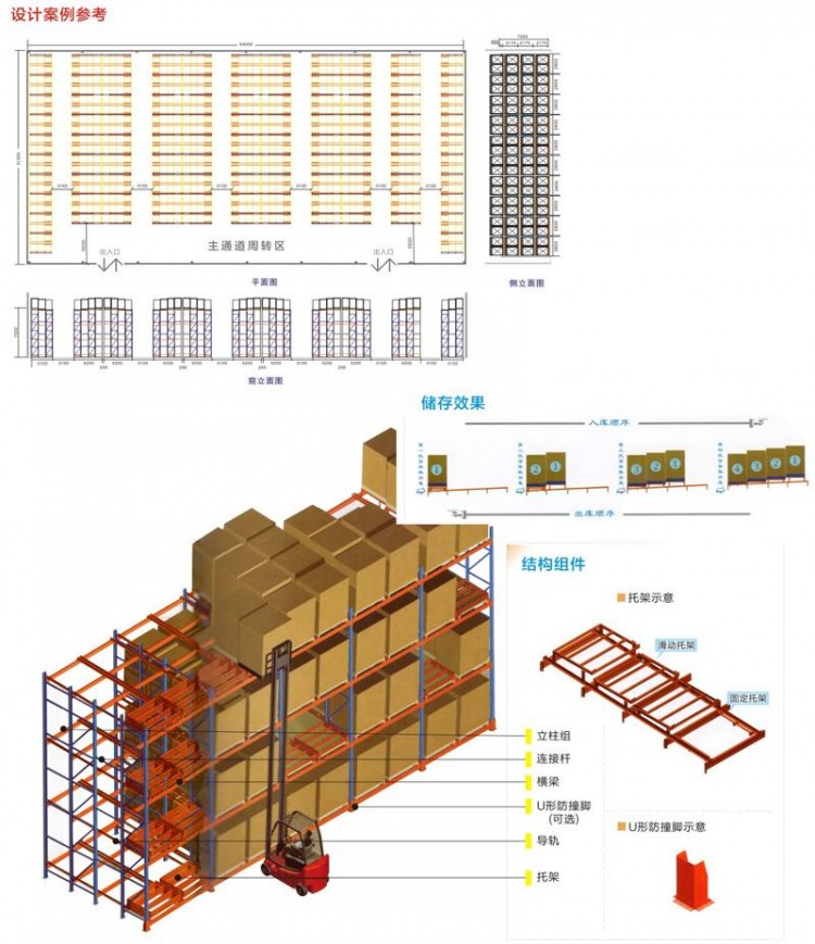 1、貨架由托盤小車等典型結(jié)構(gòu)件組成,托盤車具有可流動(dòng)特性,貨物被規(guī)定于貨架的一端進(jìn)出,并遵循先進(jìn)先出順序。