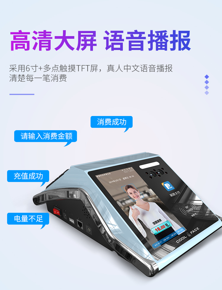 該型多媒體消費終端具備語音播報、人員照片顯示、操作信息提示、賬戶金額、補貼金額、扣費金額、工作狀態(tài)指示等功能。