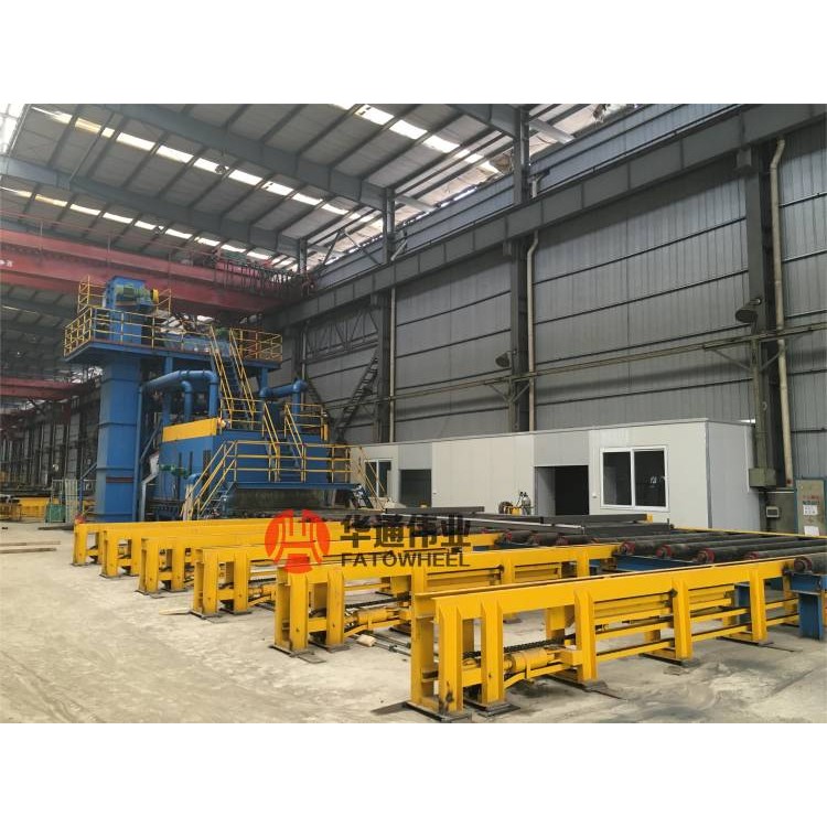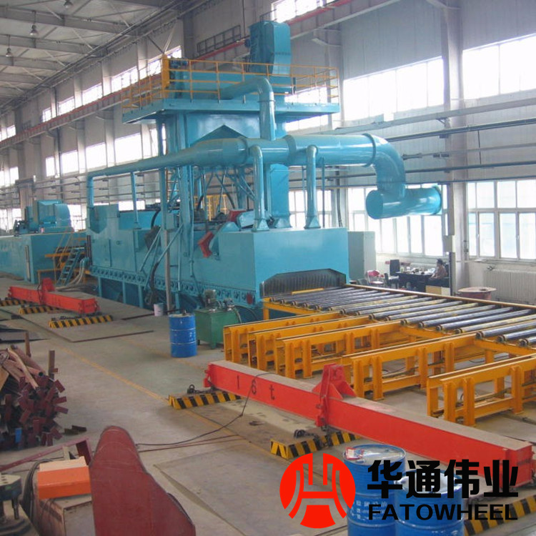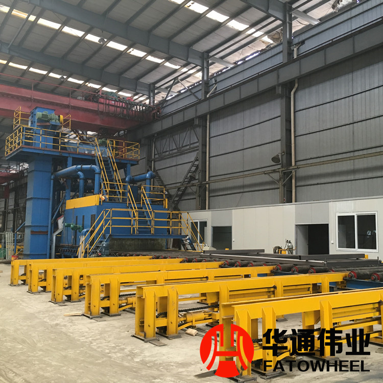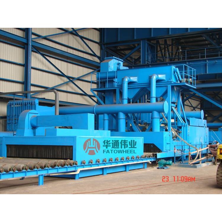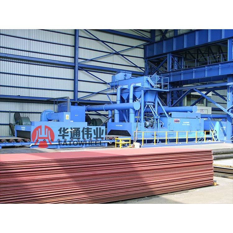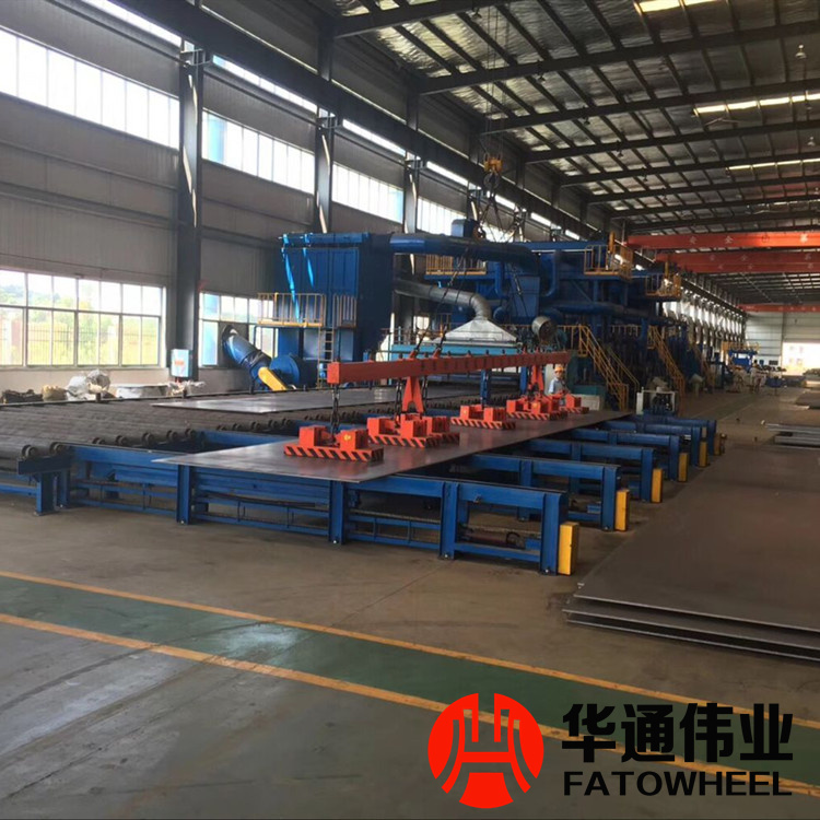 鋼材預處理線工藝是指鋼材在加工前(即原材料狀態(tài))進行表面拋丸除銹并涂上一層保護底漆的加工工藝。鋼材經過預處理可以提高機械產品和金屬構件的抗腐蝕能力,提高鋼板的抗疲勞性能,延長其使用壽命;同時還可以優(yōu)化鋼材表面工藝制作狀態(tài),有利于數控切割機下料和精密落料。此外,由于加工前鋼材形狀比較規(guī)則,有利于機械除銹和自動化噴漆,因此采用鋼材預處理可大大提高清理工作的效率,減輕清理工作的勞動強度和對環(huán)境的污染。