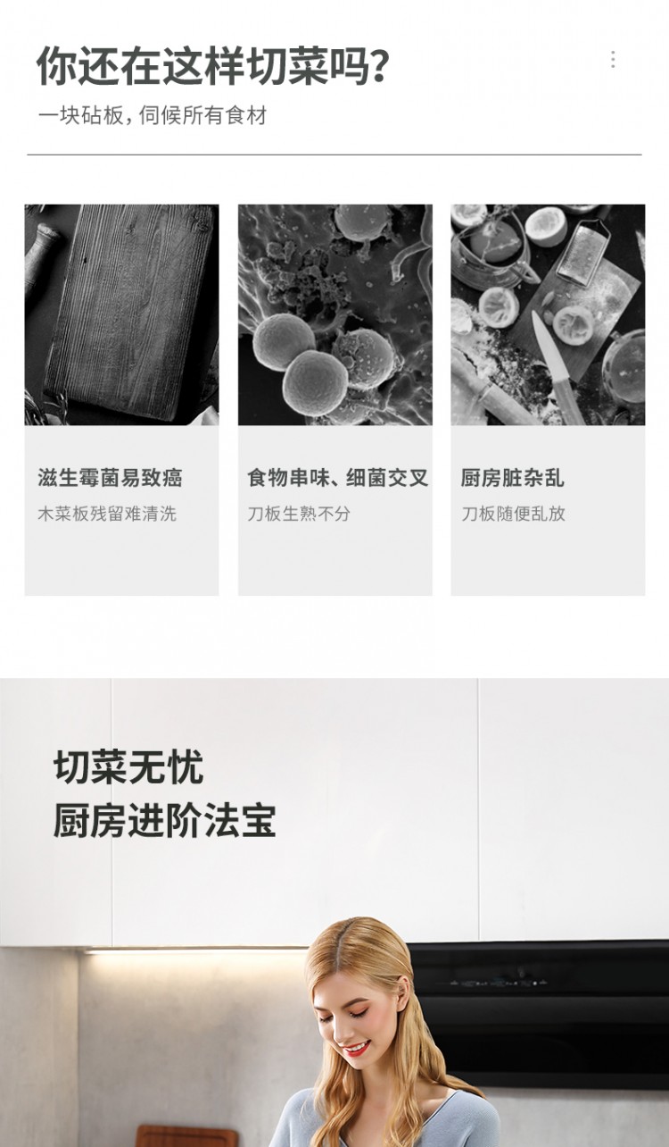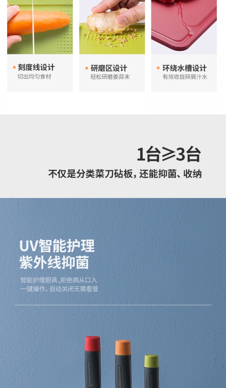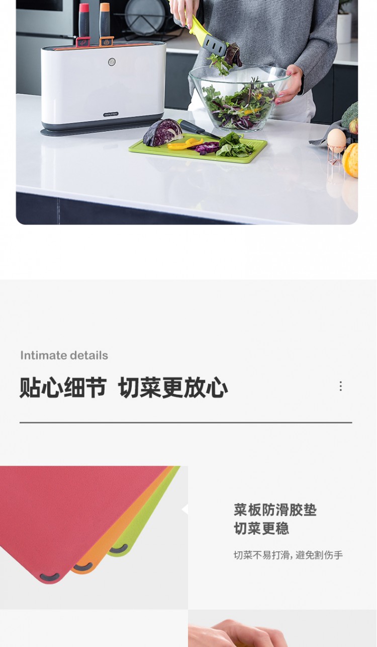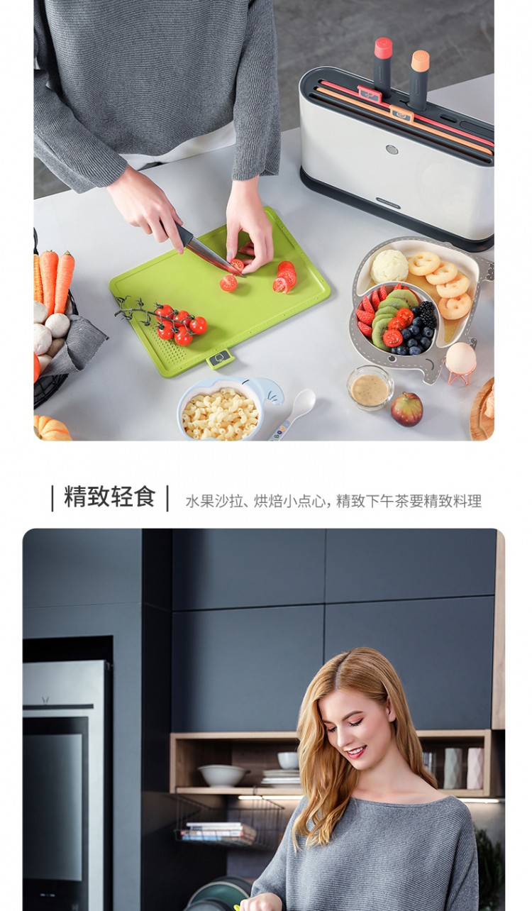 詳細信息 1.分類切菜。生肉、熟肉、蔬果專板專刀,減少交叉感染,鮮艷顏色標簽,清晰明了。 2.UV抑菌。智能護理廚具,拒絕病從口入,一鍵開啟紫外線抑菌,提高食品安全。 3.無線儲電。移動電源USB充電,3小時滿電,續(xù)航長達1個月。 4.食品級材質(zhì)。食品級竹纖維+PP混合材質(zhì),放心使用。 5.時尚廚房。一體式收納,便于存放,鮮艷的色彩更可妝點廚房。 ![]() ![]() ![]() ![]() ![]() ![]() ![]() ![]() ![]() ![]() ![]() ![]() ![]() ![]() ![]() ![]() |