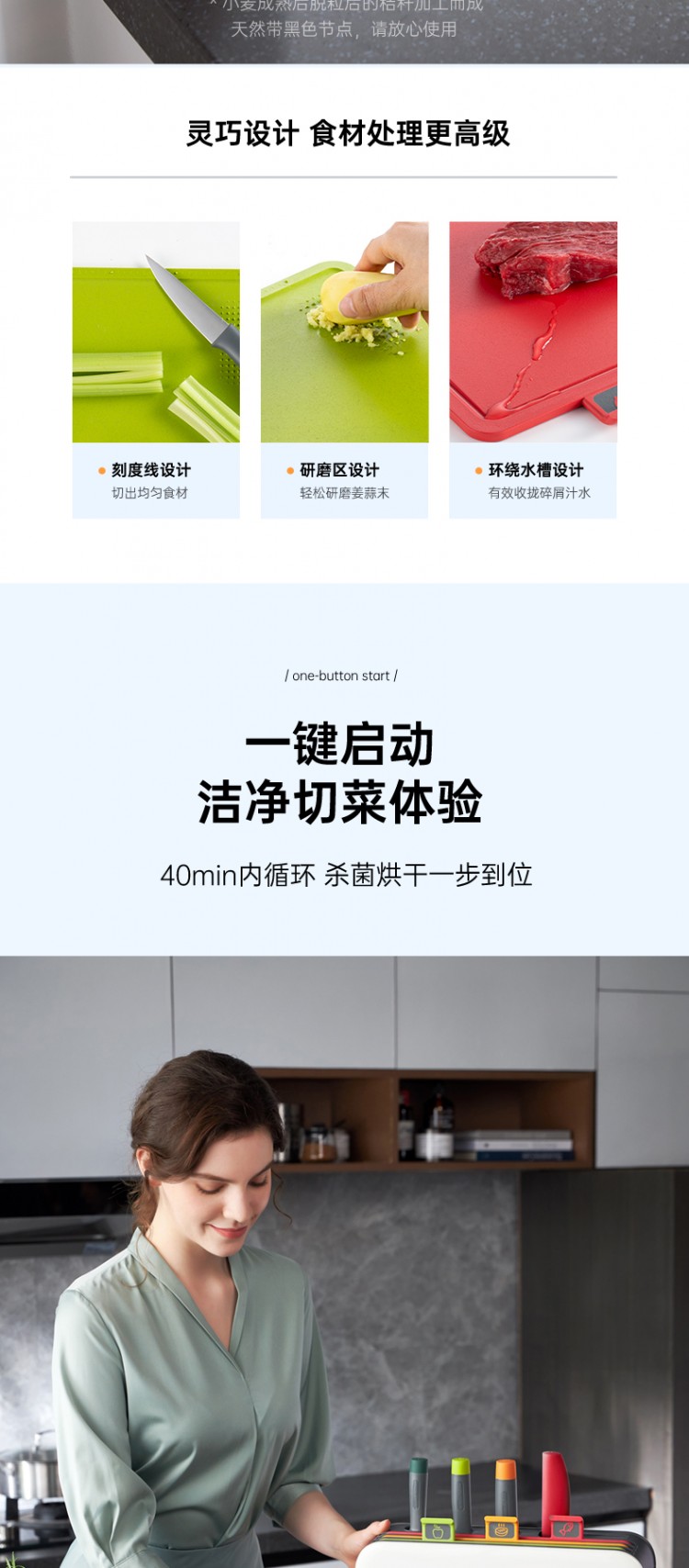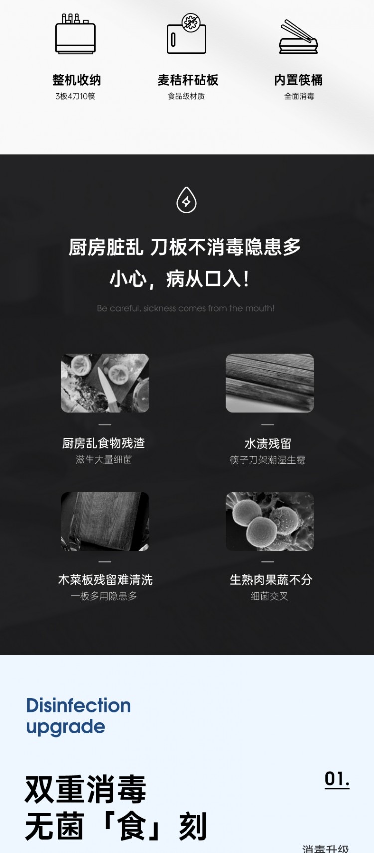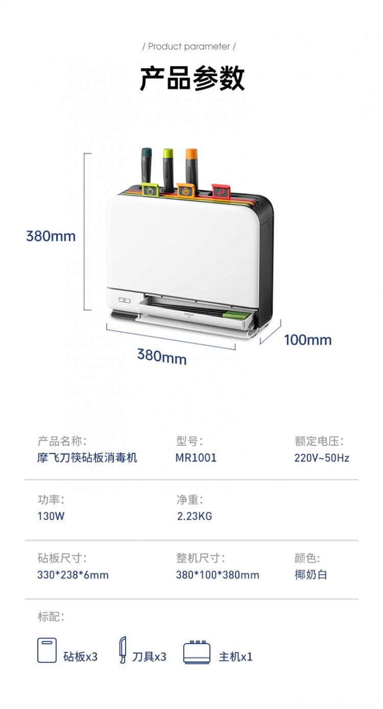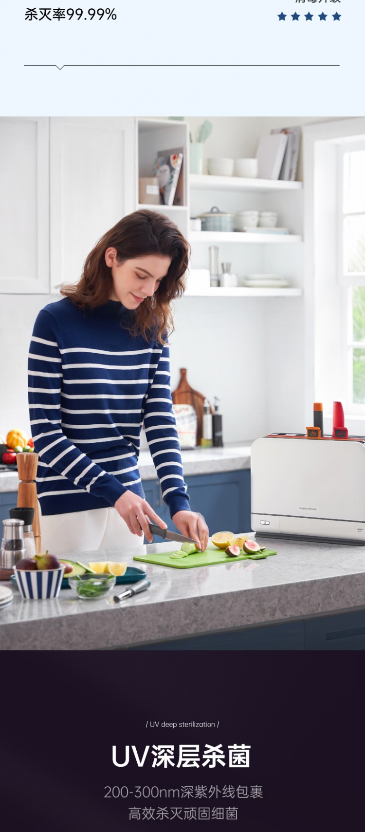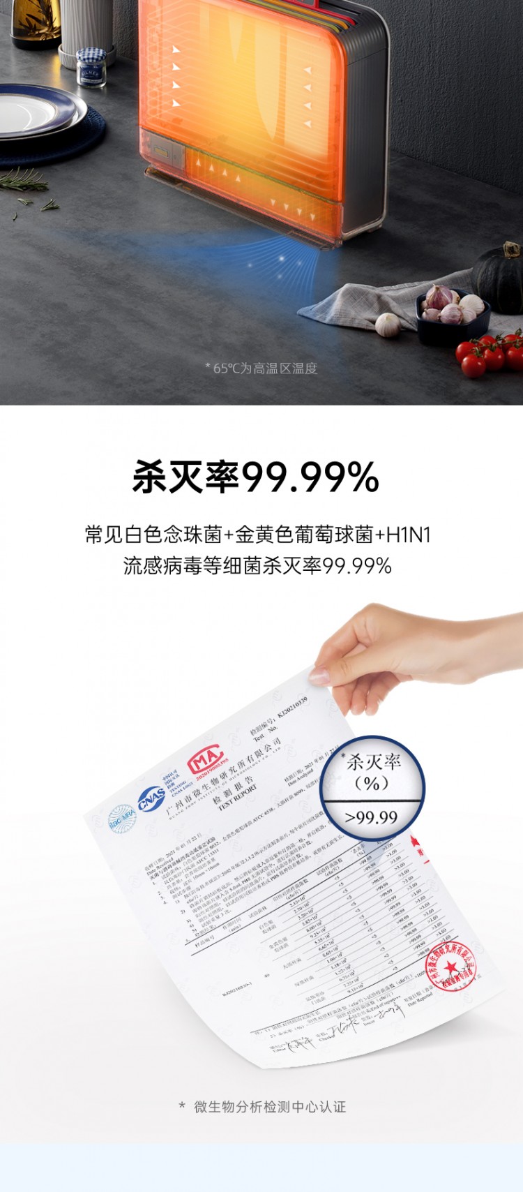 詳細(xì)信息 1.雙重保護(hù)。紫外線深層殺菌&65℃高溫?zé)嵫h(huán)殺菌,有效率高達(dá)99.9%。 2.UV深層殺菌。200-300nm深紫外線包裹,均勻照射殺滅各類頑固細(xì)菌。 3.65℃高溫?zé)嵫h(huán)殺菌。有效養(yǎng)護(hù)廚具,呵護(hù)家人健康。 4.增配隱藏式筷桶。開盒式隱藏式筷桶,殺菌烘干更徹底,呵護(hù)全家筷勺安全。 5.預(yù)留斬切刀口。不挑刀型,家里刀具也能消毒。 6.刀具功能分類管理。果蔬、熟食、生鮮專板專刀,生熟食不會產(chǎn)生交叉感染。 ![]() ![]() ![]() ![]() ![]() ![]() ![]() ![]() ![]() ![]() ![]() ![]() ![]() ![]() ![]() ![]()  |