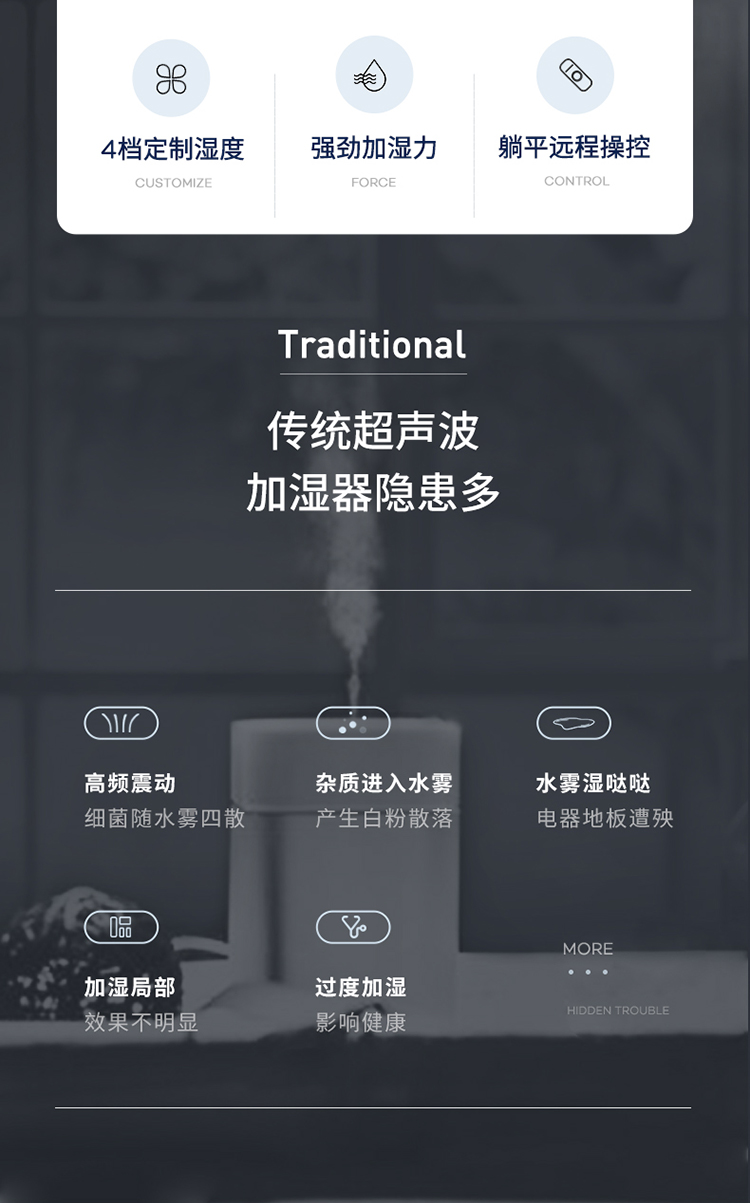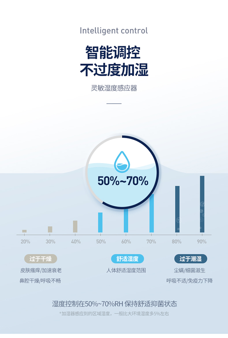 2.智能控濕。精準(zhǔn)感應(yīng),智能調(diào)控濕量,不過(guò)度加濕。