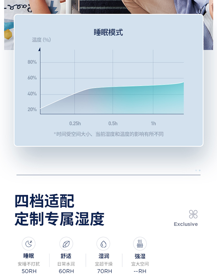 3.四季適用。加強(qiáng)、睡眠、冷氣、暖氣四大智能模式,一年四季都水潤(rùn)舒適。
