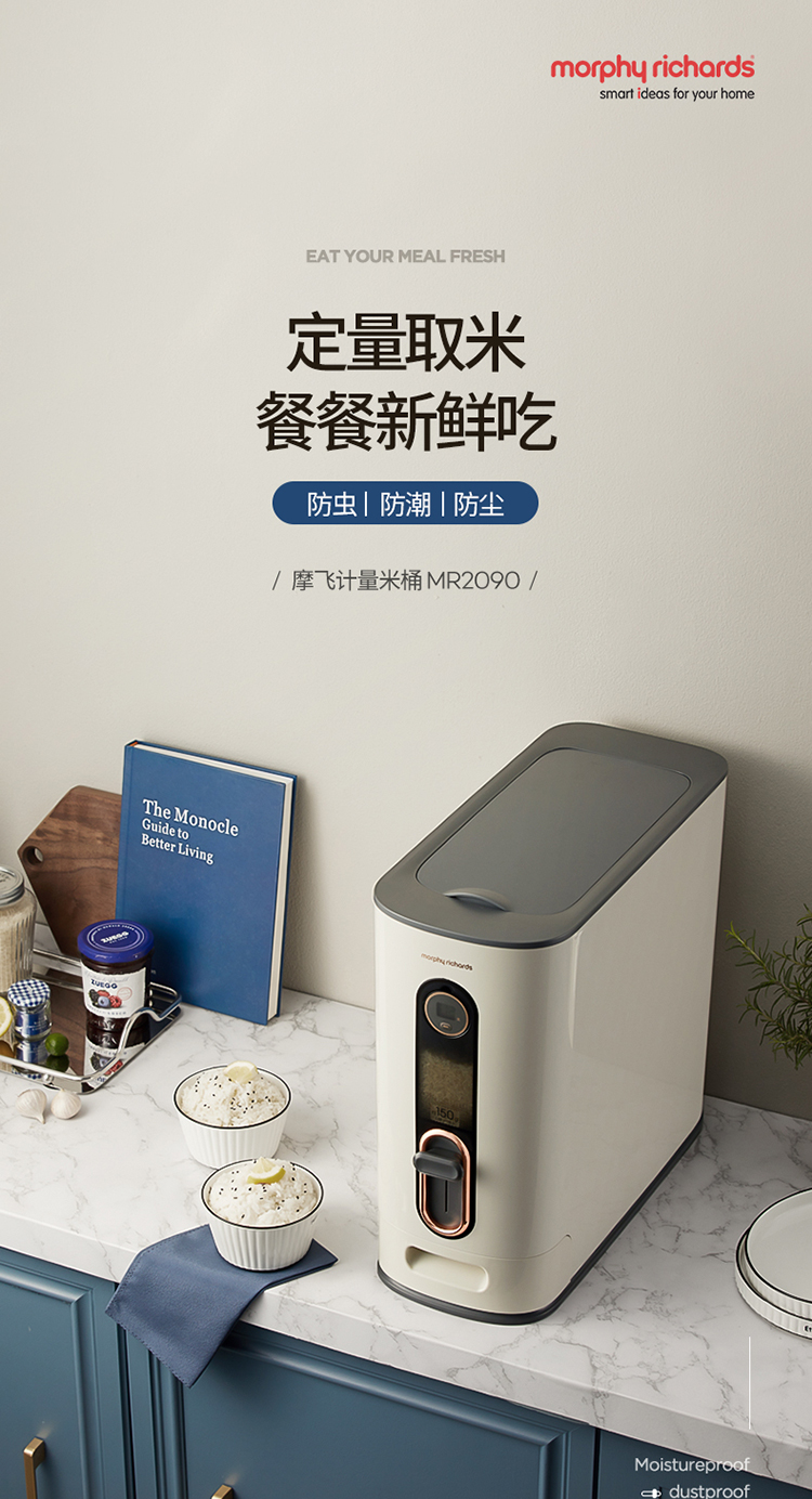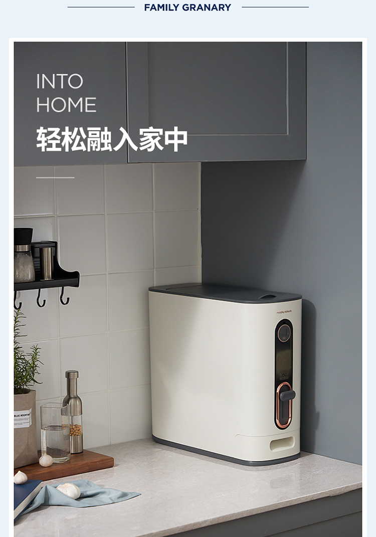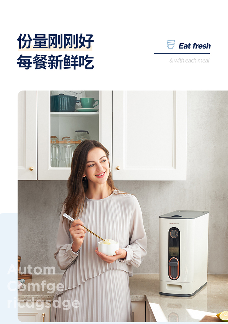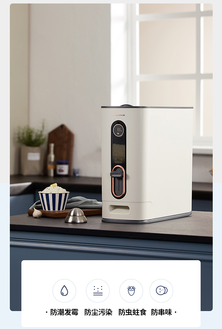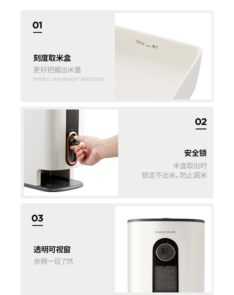 詳細(xì)信息 1.健康有“度”。單次出米150g,每餐飯量好把控,拒絕剩飯,吃得新鮮。 2.鎖住新鮮。儲(chǔ)米箱體密封結(jié)構(gòu),有效防蟲防潮,安心存放。 3.斜坡儲(chǔ)米倉(cāng)。漏斗式斜坡設(shè)計(jì),推陳出新,不留一粒陳米。 4.收納無憂。精致小巧貼墻設(shè)計(jì),窄身流線造型,輕松放置廚房一角。 ![]() ![]() ![]() ![]() ![]() ![]() ![]() ![]() ![]() ![]() ![]() ![]() ![]() ![]() ![]() ![]() ![]() ![]() ![]() ![]() ![]()  |