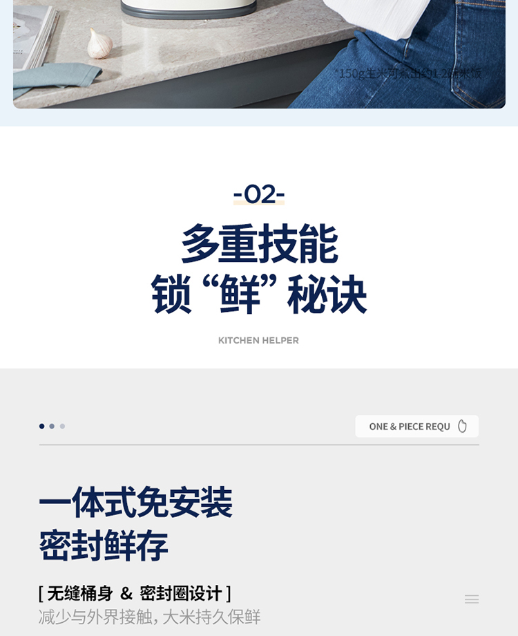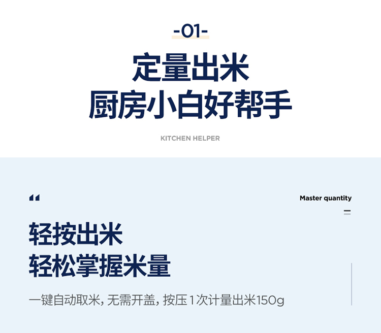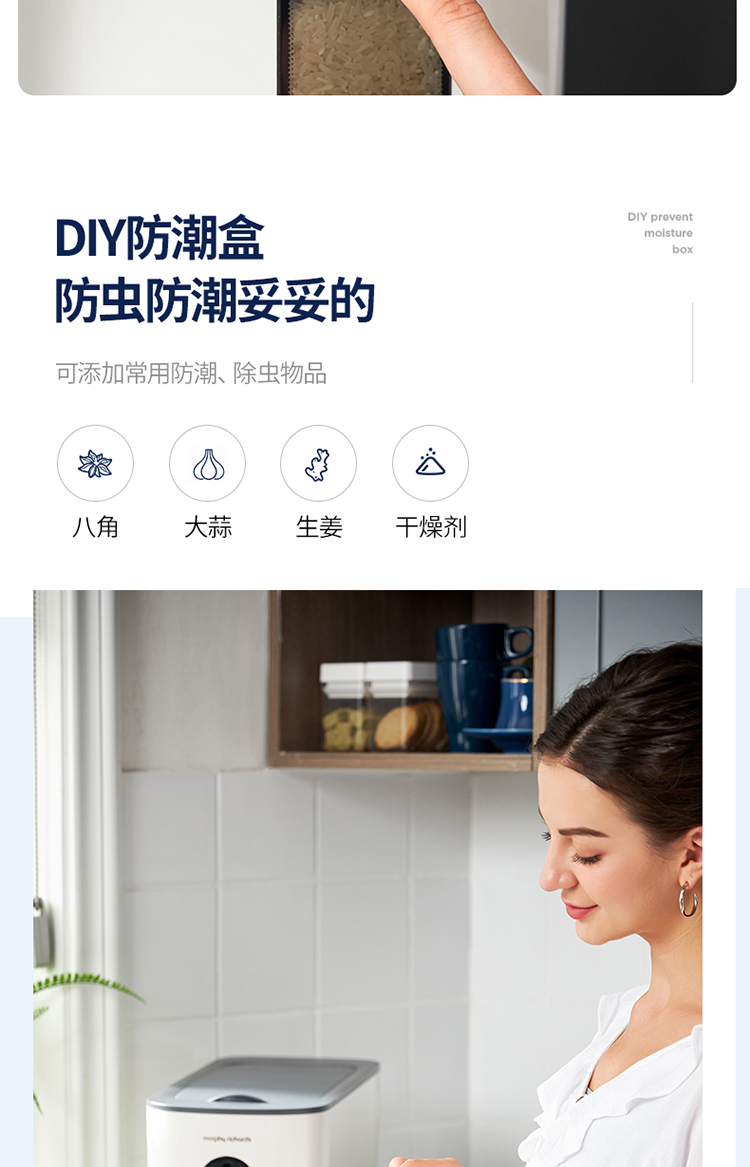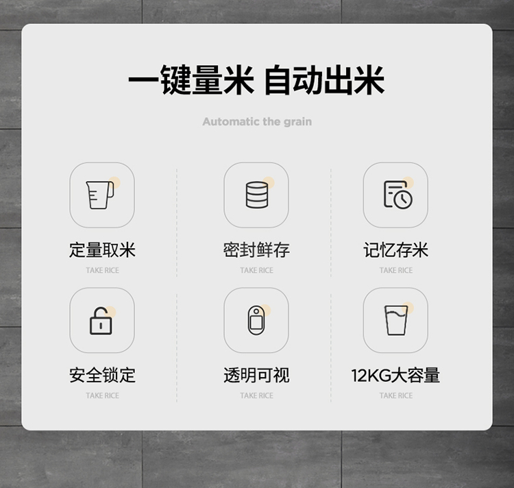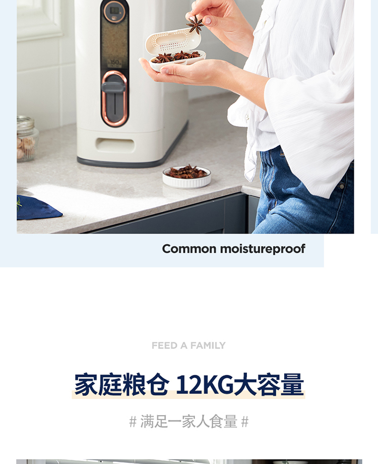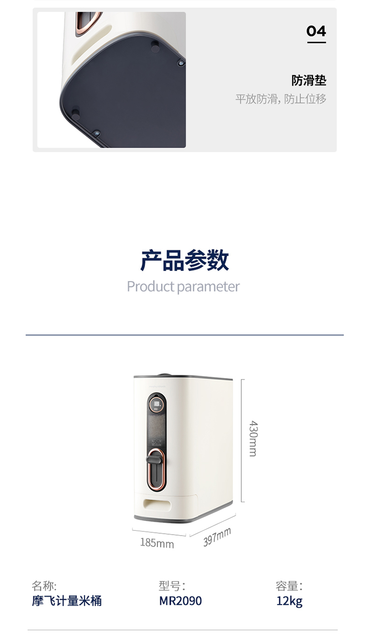 詳細(xì)信息 1.健康有“度”。單次出米150g,每餐飯量好把控,拒絕剩飯,吃得新鮮。 2.鎖住新鮮。儲(chǔ)米箱體密封結(jié)構(gòu),有效防蟲防潮,安心存放。 3.斜坡儲(chǔ)米倉(cāng)。漏斗式斜坡設(shè)計(jì),推陳出新,不留一粒陳米。 4.收納無憂。精致小巧貼墻設(shè)計(jì),窄身流線造型,輕松放置廚房一角。 ![]() ![]() ![]() ![]() ![]() ![]() ![]() ![]() ![]() ![]() ![]() ![]() ![]() ![]() ![]() ![]() ![]() ![]() ![]() ![]() ![]()  |