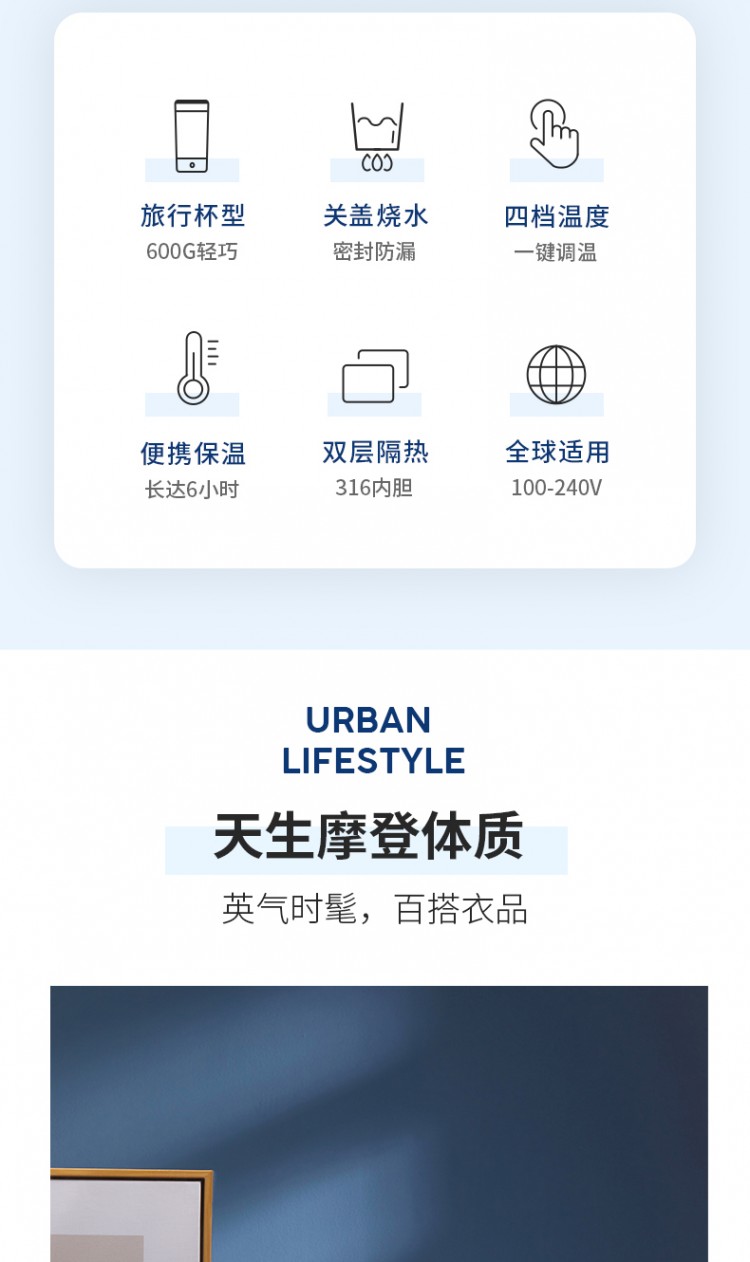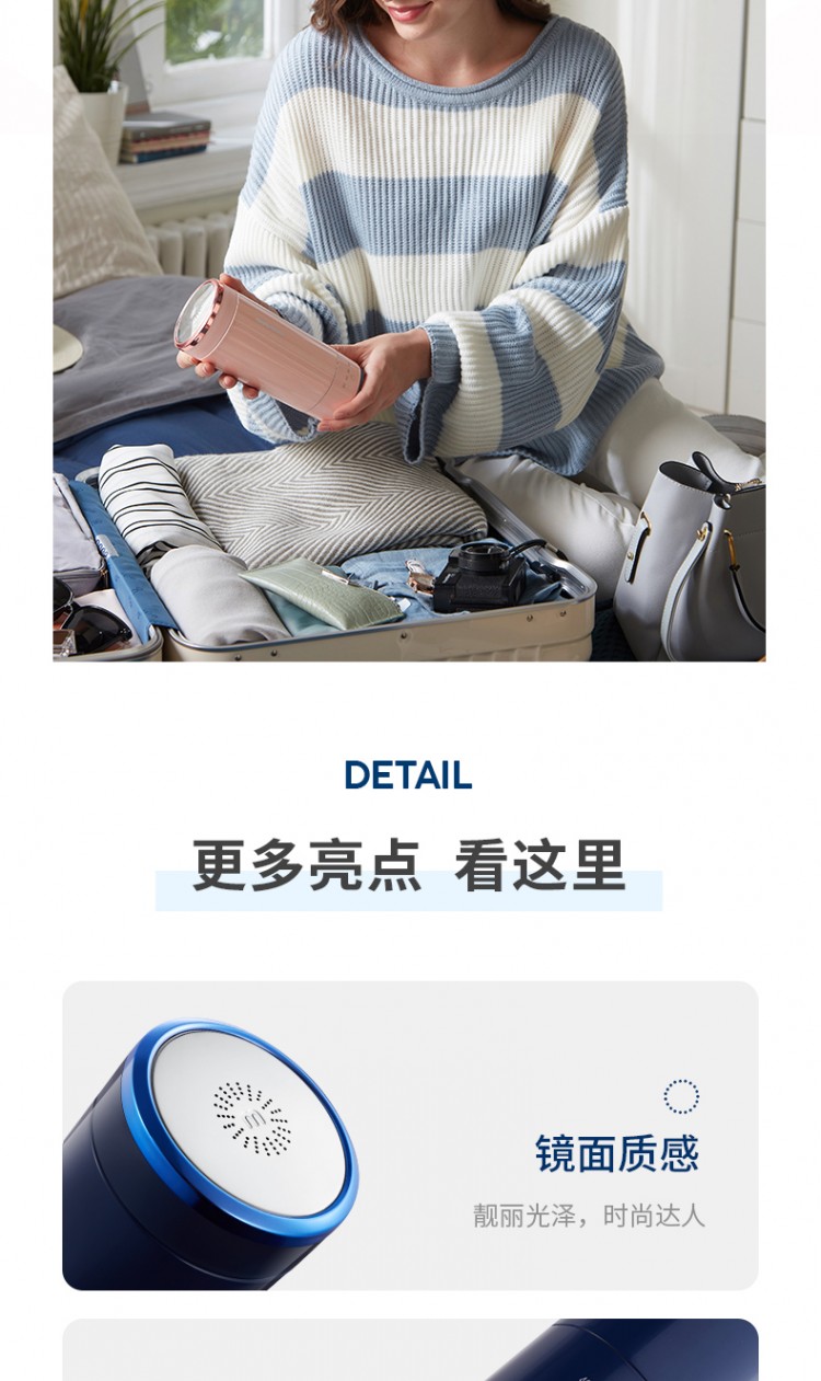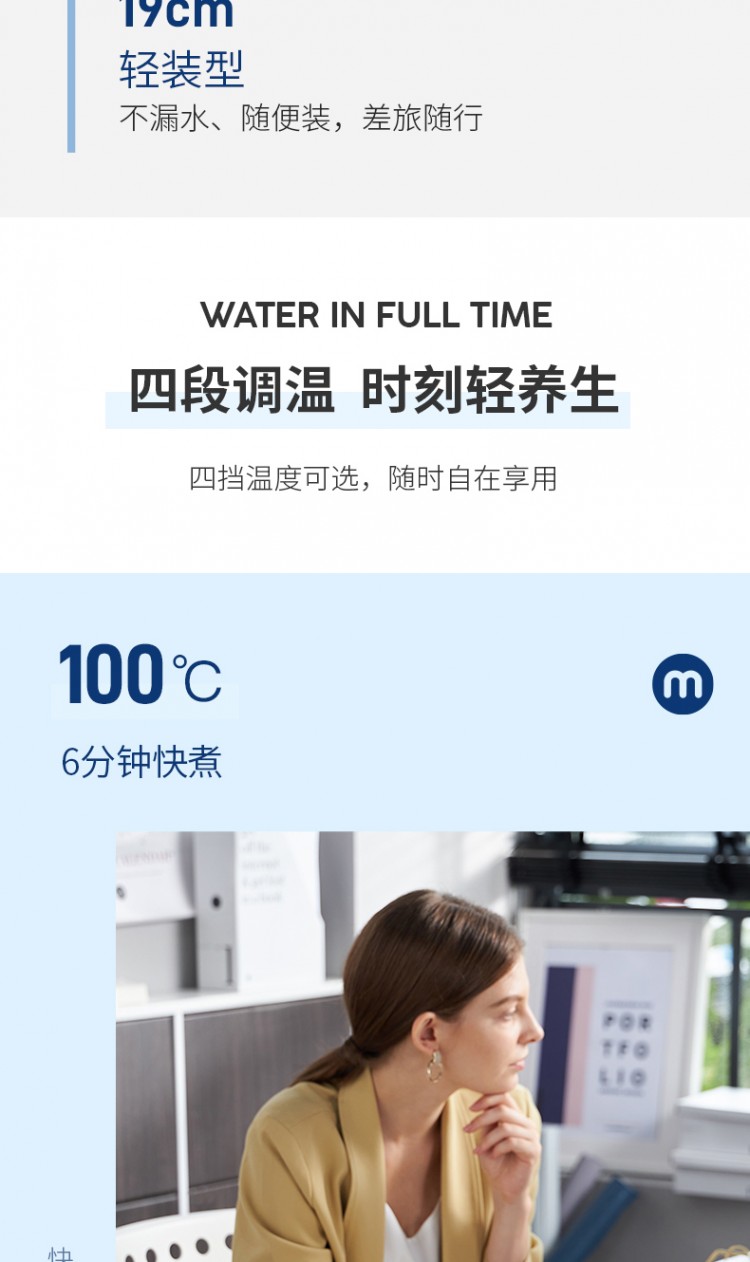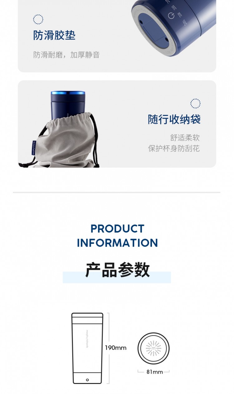 詳細(xì)信息 1.輕巧隨行。300ML輕便小巧,大小箱包都適配。 2.6H長(zhǎng)效保溫。雙層真空保溫,6小時(shí)40℃在線,每一口都溫暖入心。 3.關(guān)蓋燒水。泄壓技術(shù),只出蒸汽不漏水,關(guān)蓋燒水更安心。 4.316不銹鋼內(nèi)膽。食品級(jí)優(yōu)質(zhì)材質(zhì),耐腐蝕耐高溫,每一口都是放心水。 5.四檔調(diào)溫。4段水溫,一鍵調(diào)控40℃/55℃/80℃/100℃。 6.全球通用。自適應(yīng)變壓技術(shù),(100~240V電壓)。 ![]() ![]() ![]() ![]() ![]() ![]() ![]() ![]() ![]() ![]() ![]() ![]() ![]() ![]() ![]() ![]() ![]() ![]() ![]() ![]() |