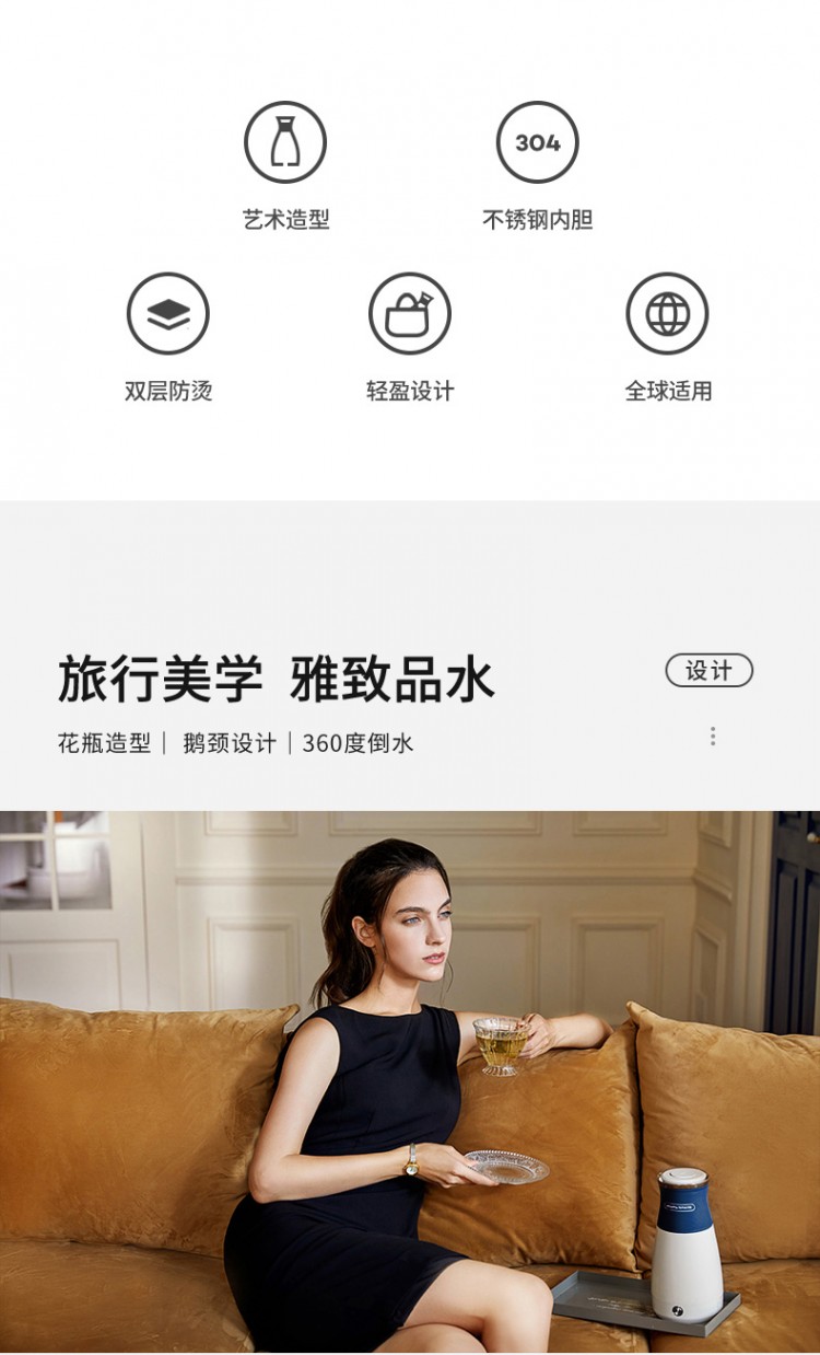 詳細(xì)信息 1.優(yōu)雅延續(xù)。延續(xù)經(jīng)典天鵝頸造型,同樣的優(yōu)雅與便捷兼具。 2.雙層防燙壺身。親膚防燙,內(nèi)膽堅(jiān)持使用優(yōu)質(zhì)不銹鋼,安全舒心。 3.升級(jí)輕便。減重約1/3,更輕便,走的更遠(yuǎn)。 4.全球通用。自適應(yīng)變壓技術(shù),(100~240V電壓)。 5.煮沸即停。智能感溫控制,避免離開(kāi)后反復(fù)燒開(kāi)。 6.便捷隨行。電源線可完全隱藏于底座。 ![]() ![]() ![]() ![]() ![]() ![]() ![]() ![]() ![]() ![]() ![]() ![]() ![]() ![]() ![]() ![]()  |
