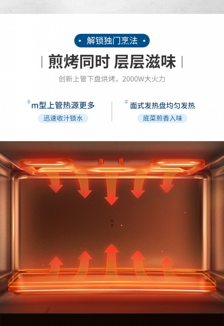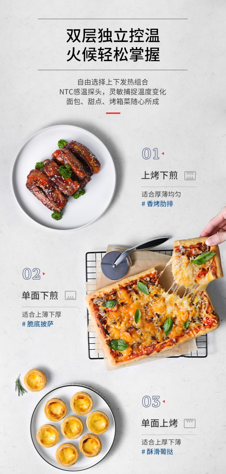 3.雙層發(fā)熱,獨(dú)立控溫。自由選擇上下發(fā)熱組合,美味隨心所成。