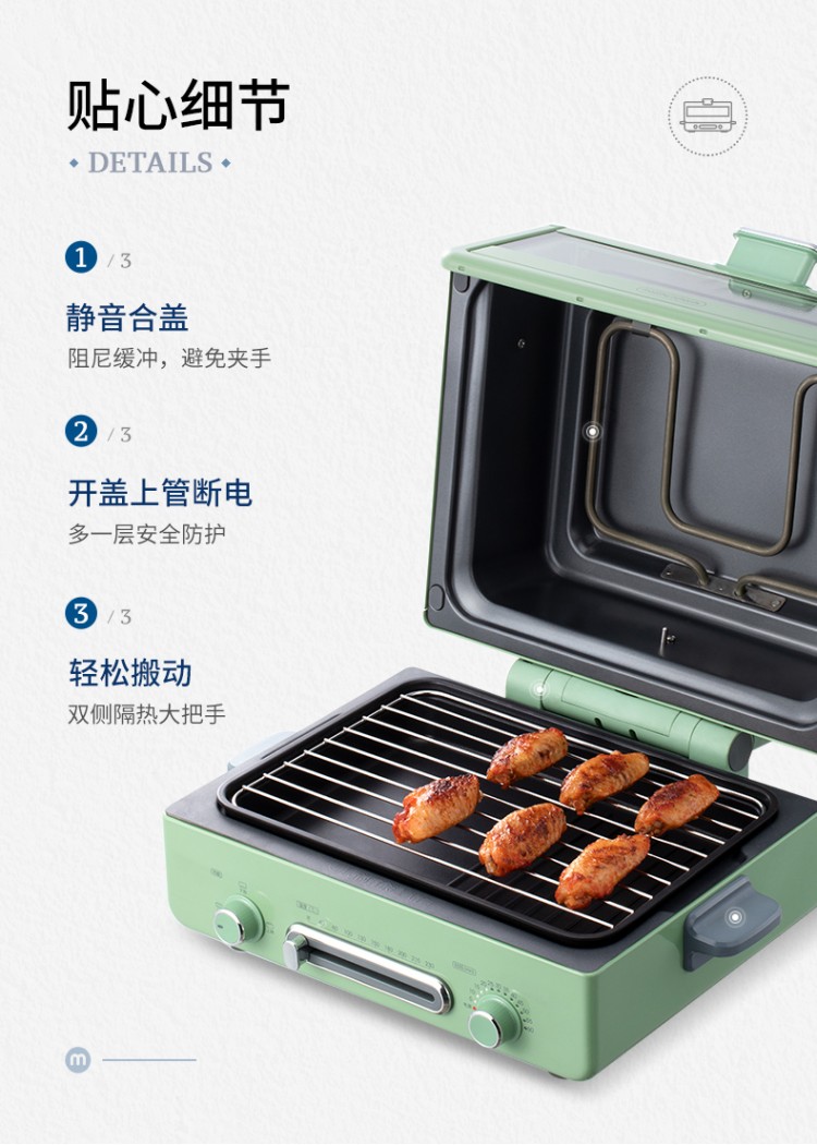 詳細(xì)信息 1.玩趣翻蓋,烘烤有新意。多樣開(kāi)合,翻轉(zhuǎn)全新玩法。 2.多項(xiàng)全能。烘焙、燒烤、煎焗多合一,打開(kāi)味蕾N次方。 3.雙層發(fā)熱,獨(dú)立控溫。自由選擇上下發(fā)熱組合,美味隨心所成。 4.面式烘烤。加熱更均勻、清洗更方便。 ![]() ![]() ![]() ![]() ![]() ![]() ![]() ![]() ![]() ![]() ![]() ![]() ![]() ![]() ![]() ![]() ![]() ![]() ![]() |