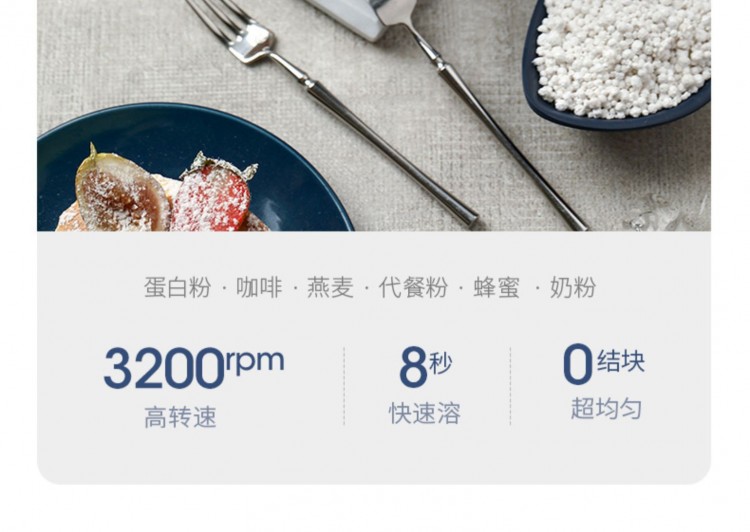 3.8秒速溶。告別粉末結(jié)塊,強(qiáng)勁扭力,空轉(zhuǎn)速度約為3200rpm,順滑口感so easy。