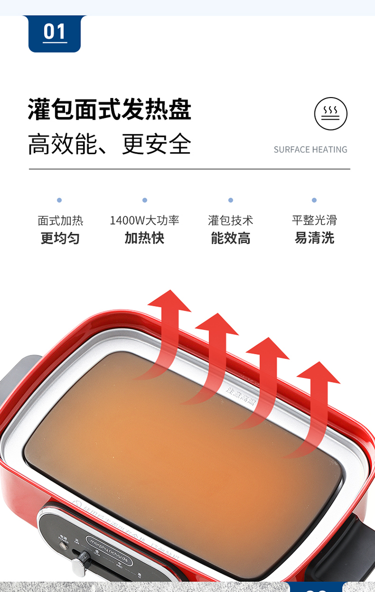 2.面式發(fā)熱盤。1400w大功率熱盤,加熱均勻,平滑面板,方便清潔。