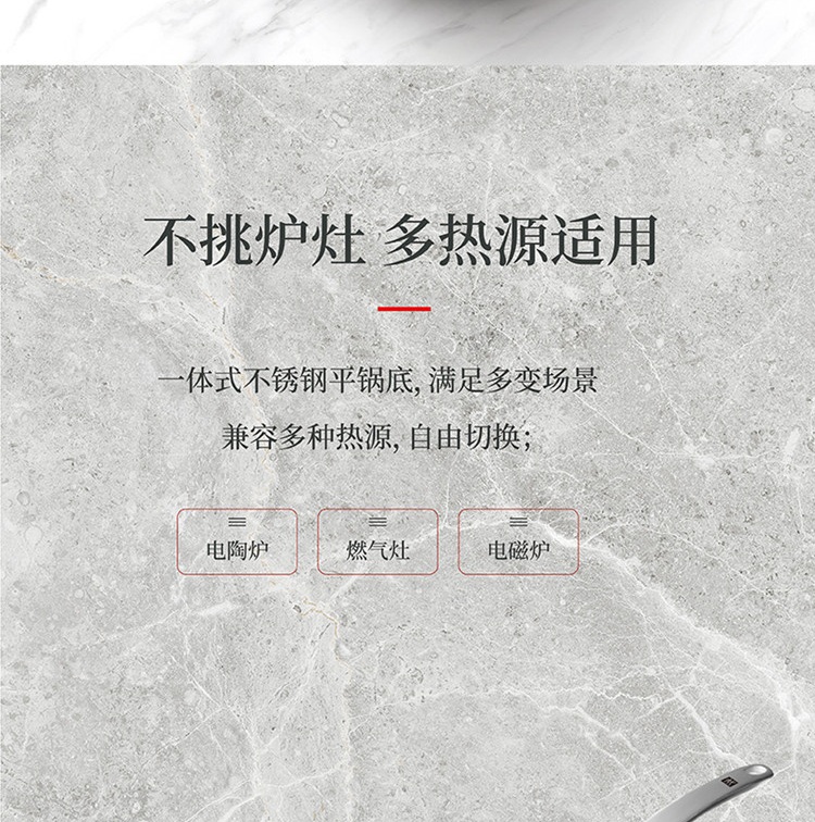 2. 不挑爐灶,全系適配:一體式不銹鋼平鍋底,滿足多變場景;兼容多種熱源,自由切換;