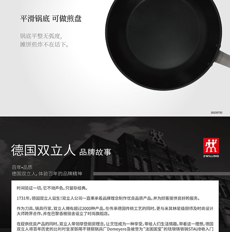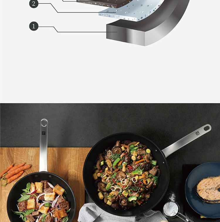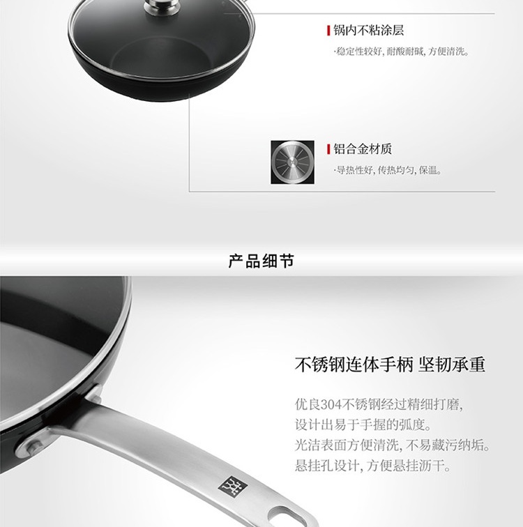 3. 輕松打理,盡顯廚藝:雙立人平底不粘煎鍋內涂層威堡龍C3+不粘涂層,油污不易附著;外涂層威堡龍高溫漆,耐磨不易刮花。