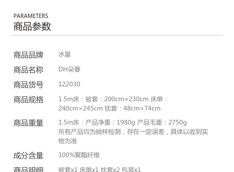 規(guī)格:被套:200*230cm;床單:230*250cm;枕套:48*74cm*2