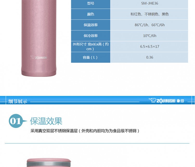 象印不銹鋼杯子SM-JHE36 真空保溫杯 辦公室水杯