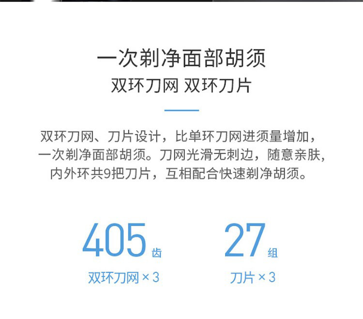 3.雙環(huán)貼面刀網(wǎng),雙倍動(dòng)力舒適快剃。