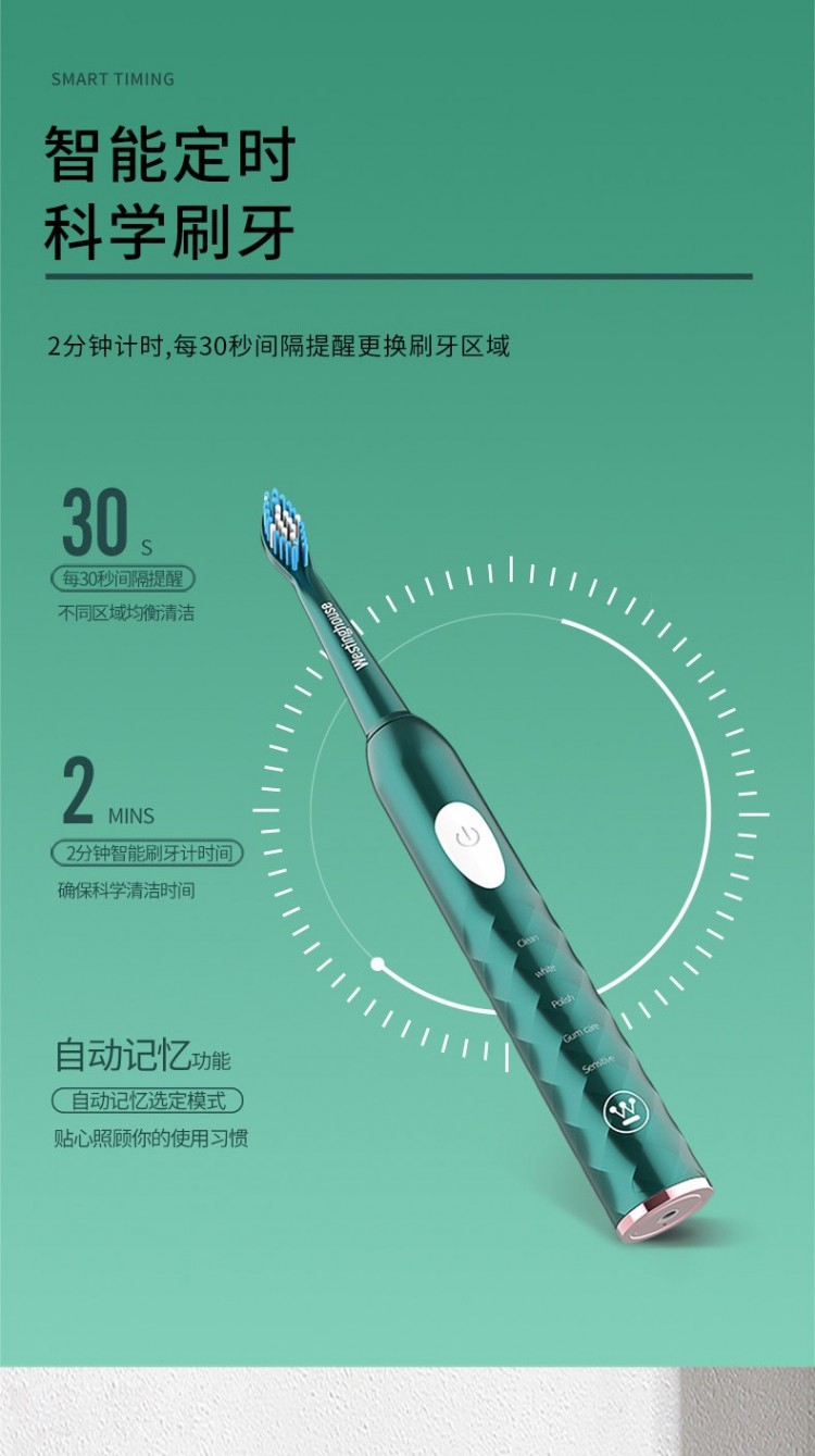 2.2分鐘計(jì)時(shí),每30秒間隔提醒更換刷牙區(qū)域;