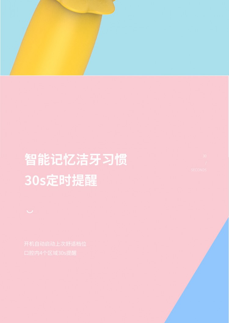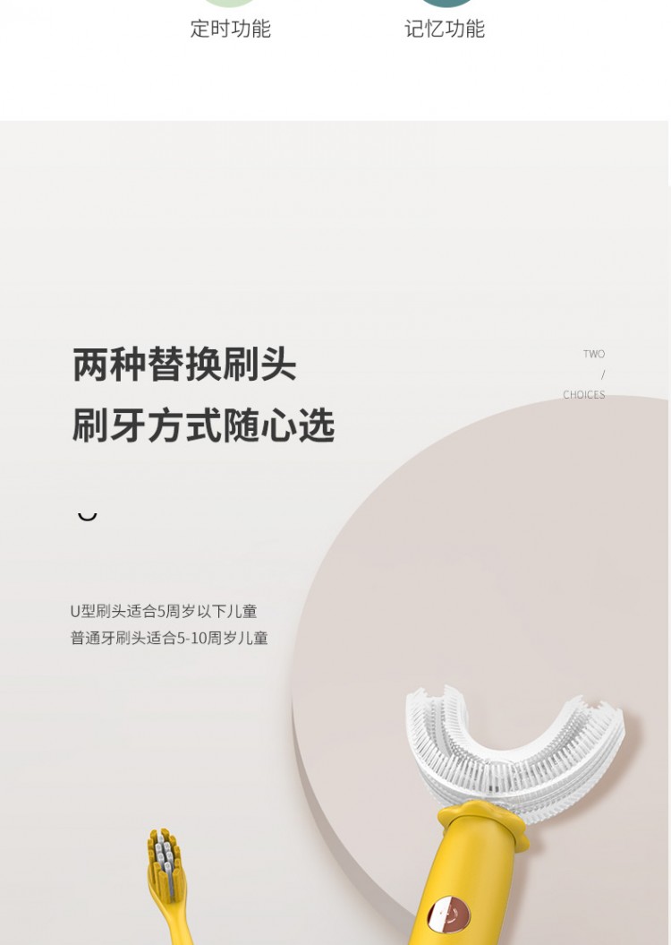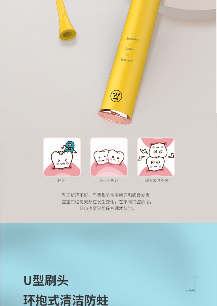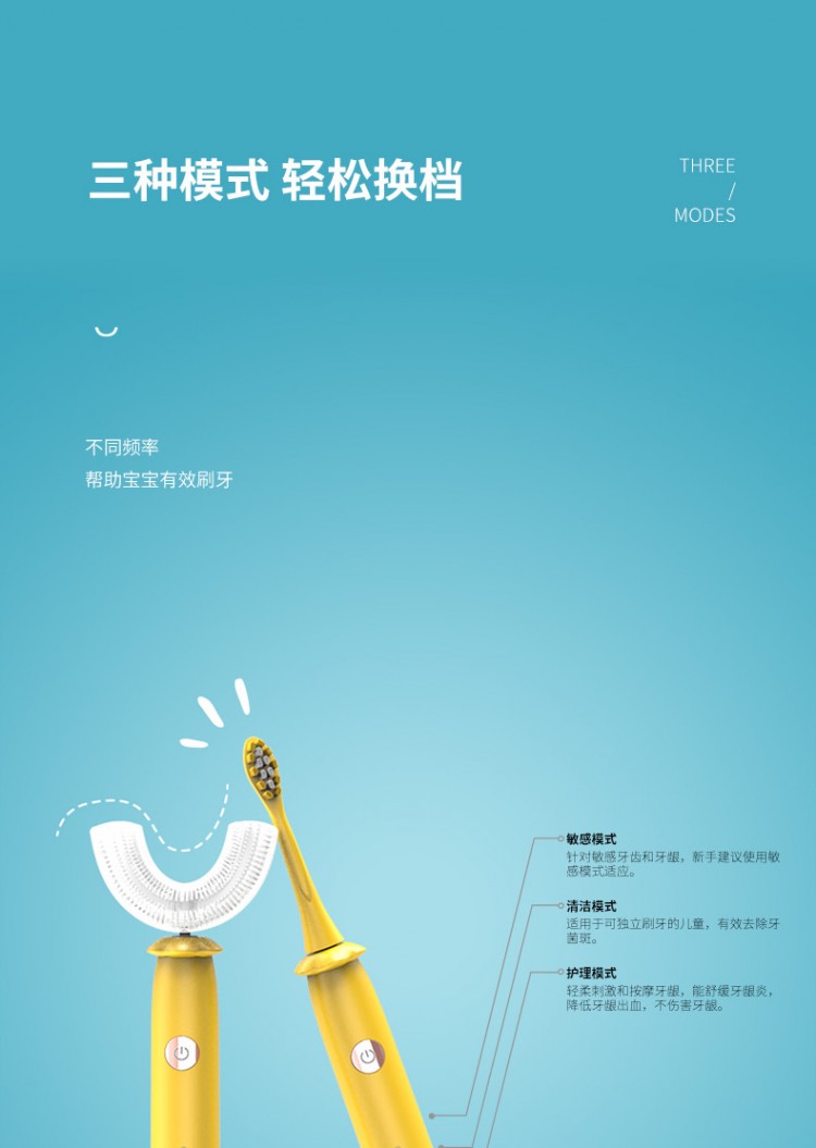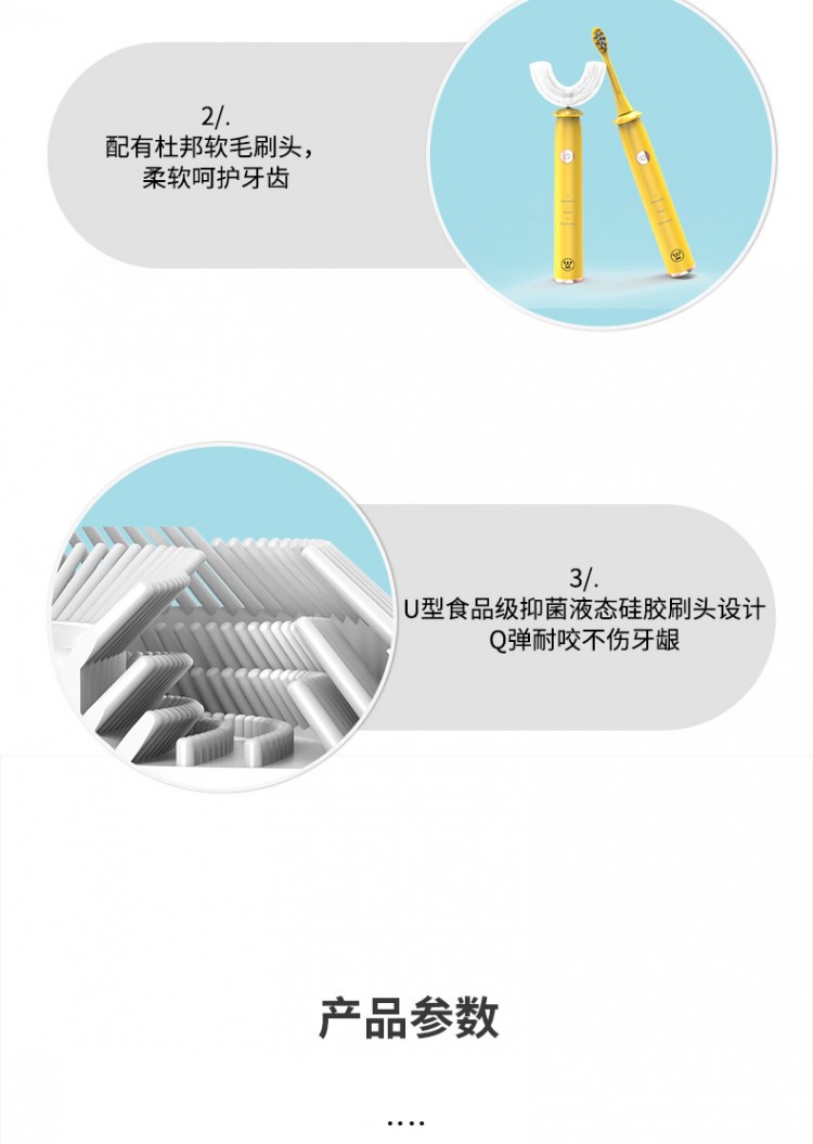 詳細(xì)信息 產(chǎn)品特點(diǎn): 1.U型設(shè)計(jì),360度潔凈牙齒,讓寶寶牙齒白凈閃耀; 2.另配杜邦軟毛刷頭,柔軟呵護(hù)牙齒; 3.U型食品級(jí)抑菌液態(tài)硅膠刷頭設(shè)計(jì),Q彈耐咬不傷牙齦; 4.4PX7級(jí)防水,檔位記憶功能,定時(shí)功能。 ![]() ![]() ![]() ![]() ![]() ![]() ![]() ![]() ![]() ![]() ![]() ![]() ![]() ![]() ![]()  |